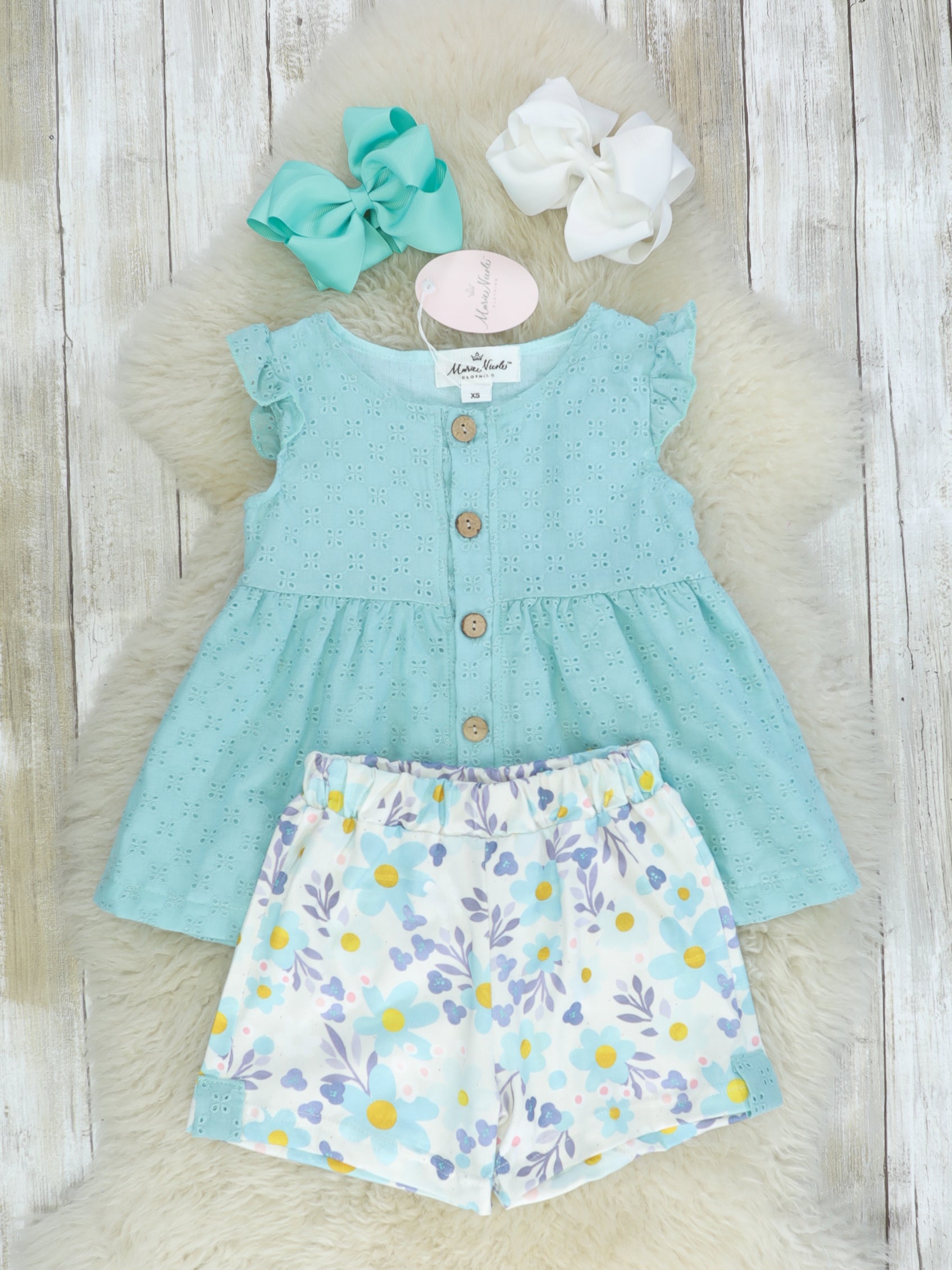 A minty eyelet lace top and dainty floral shorts are exactly what you need for summer days!