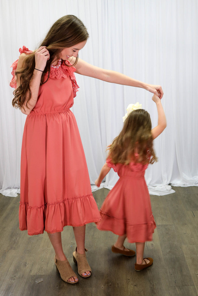 Match your mini for Mother's Day in this gorgeous dusty rose ruffled midi dress!
