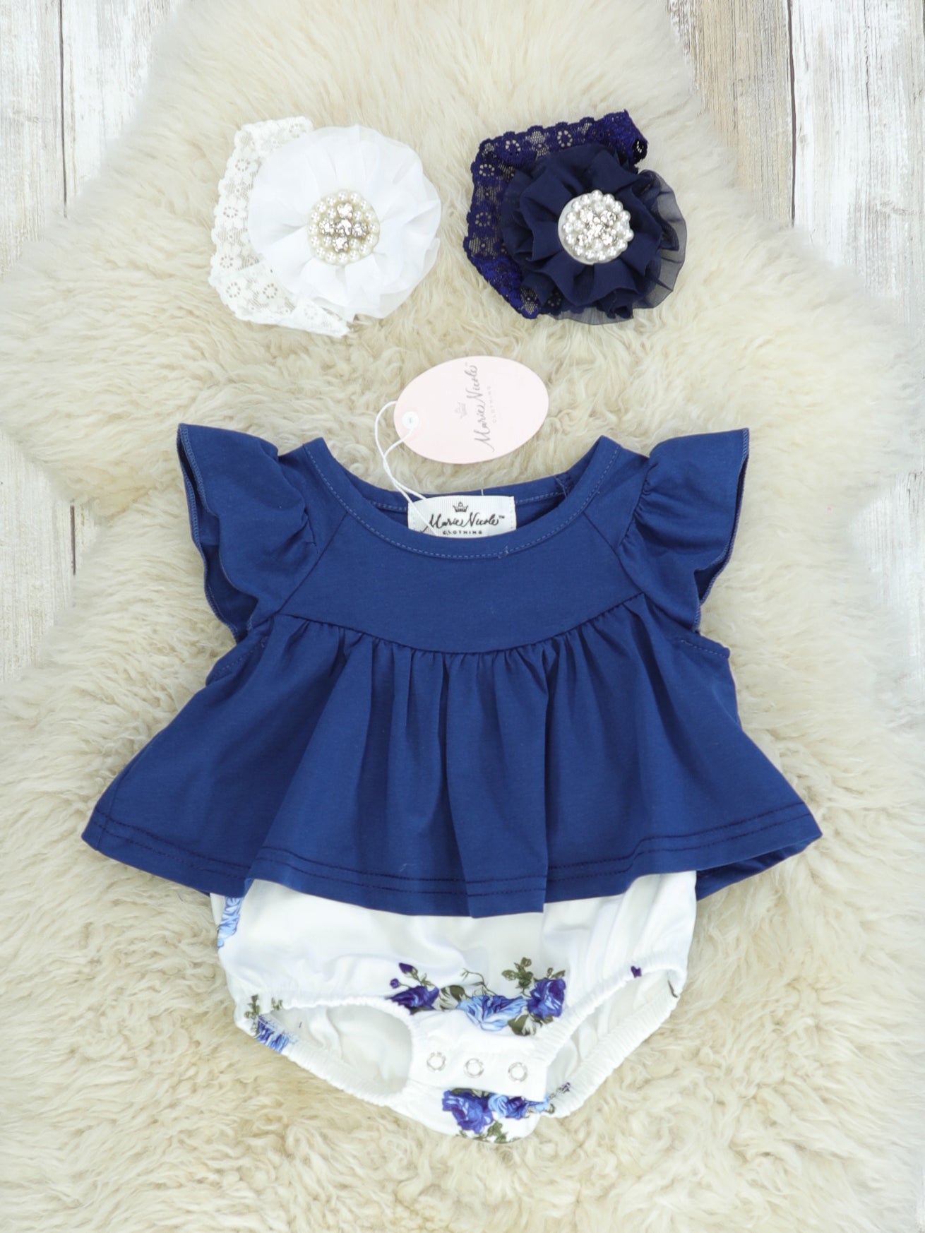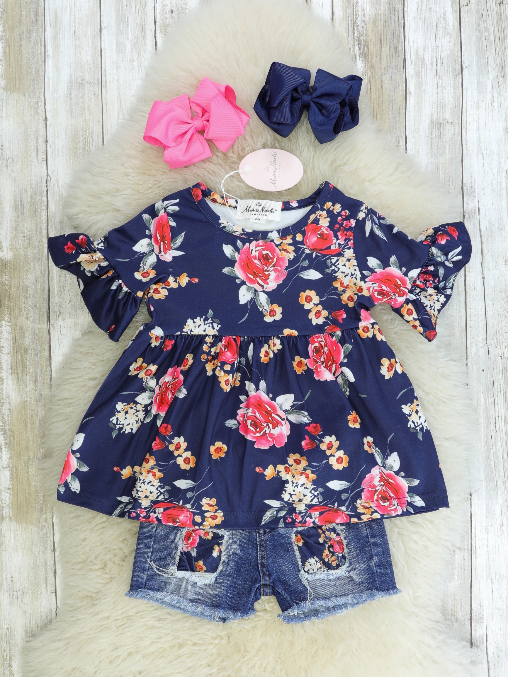 Navy & Pink Floral Tunic & Distressed Denim Shorts Outfit