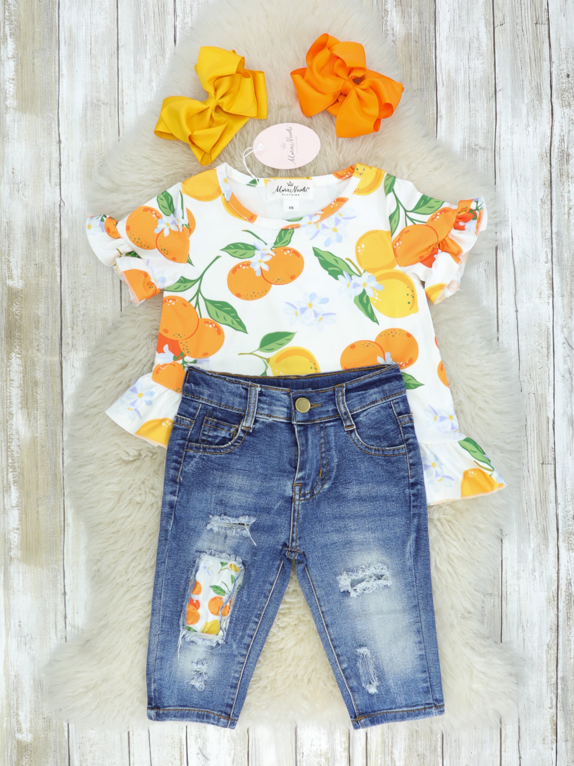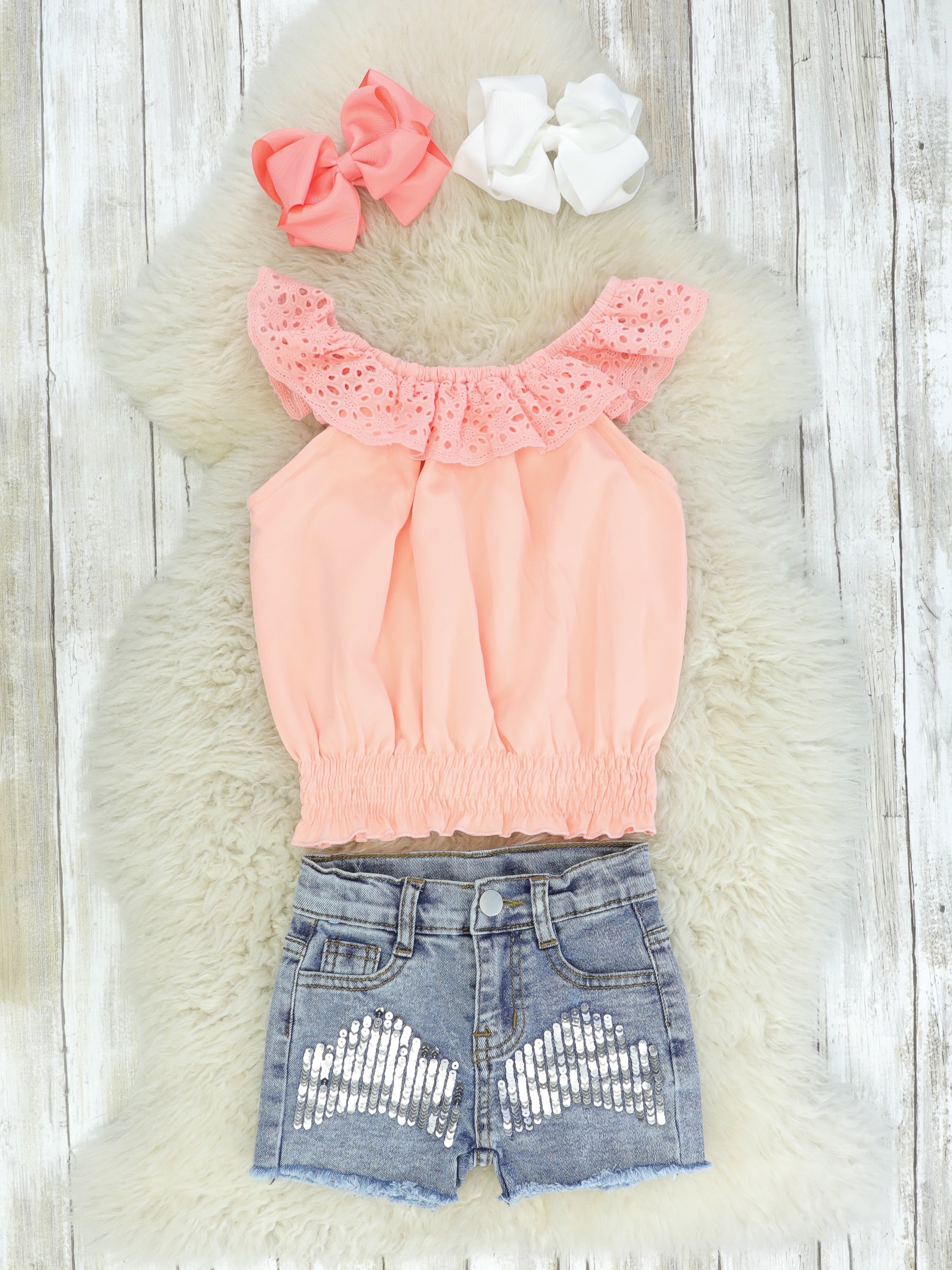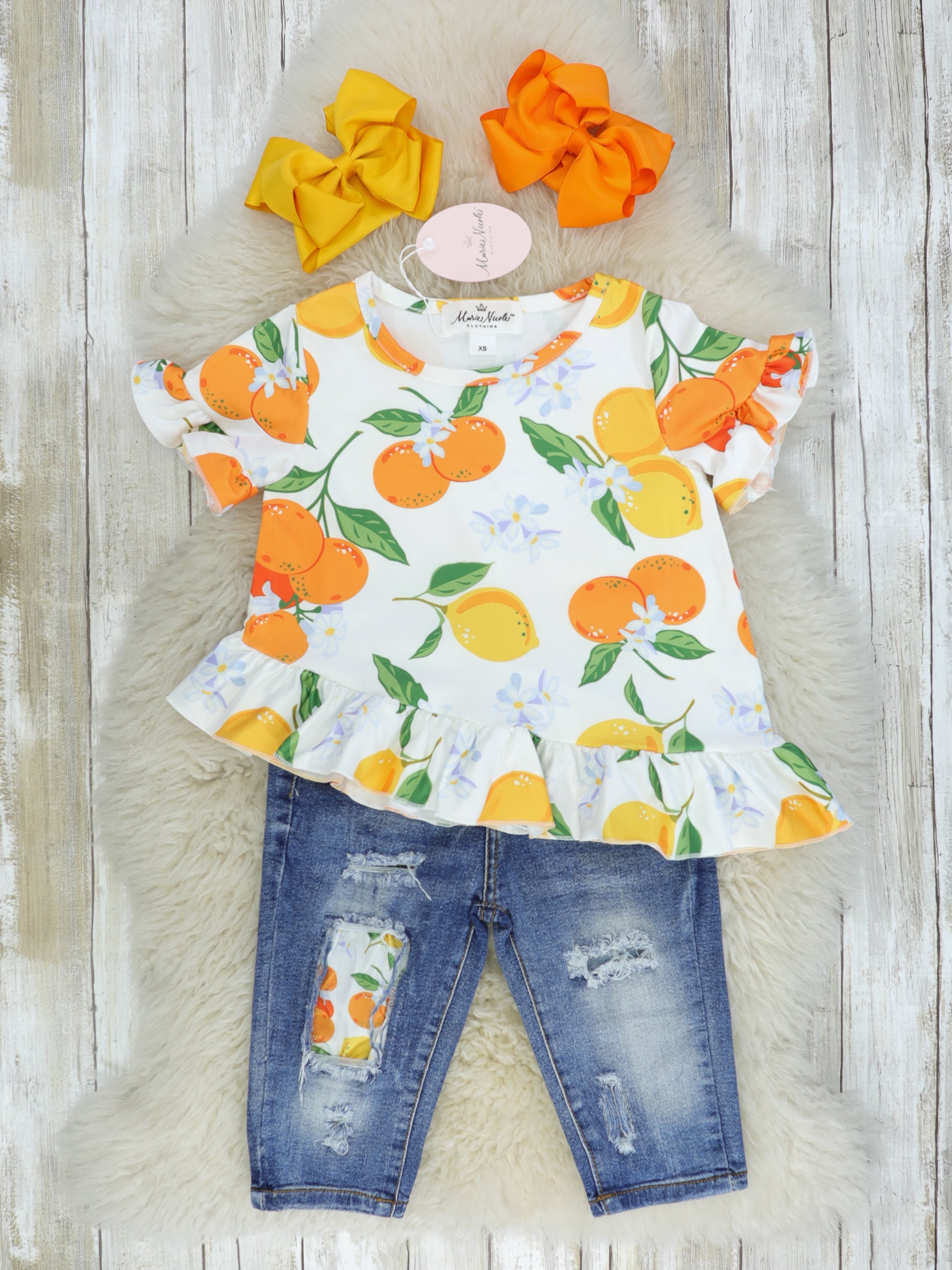 Peachy Tiered Ruffle Top & Distressed Denim Outfit