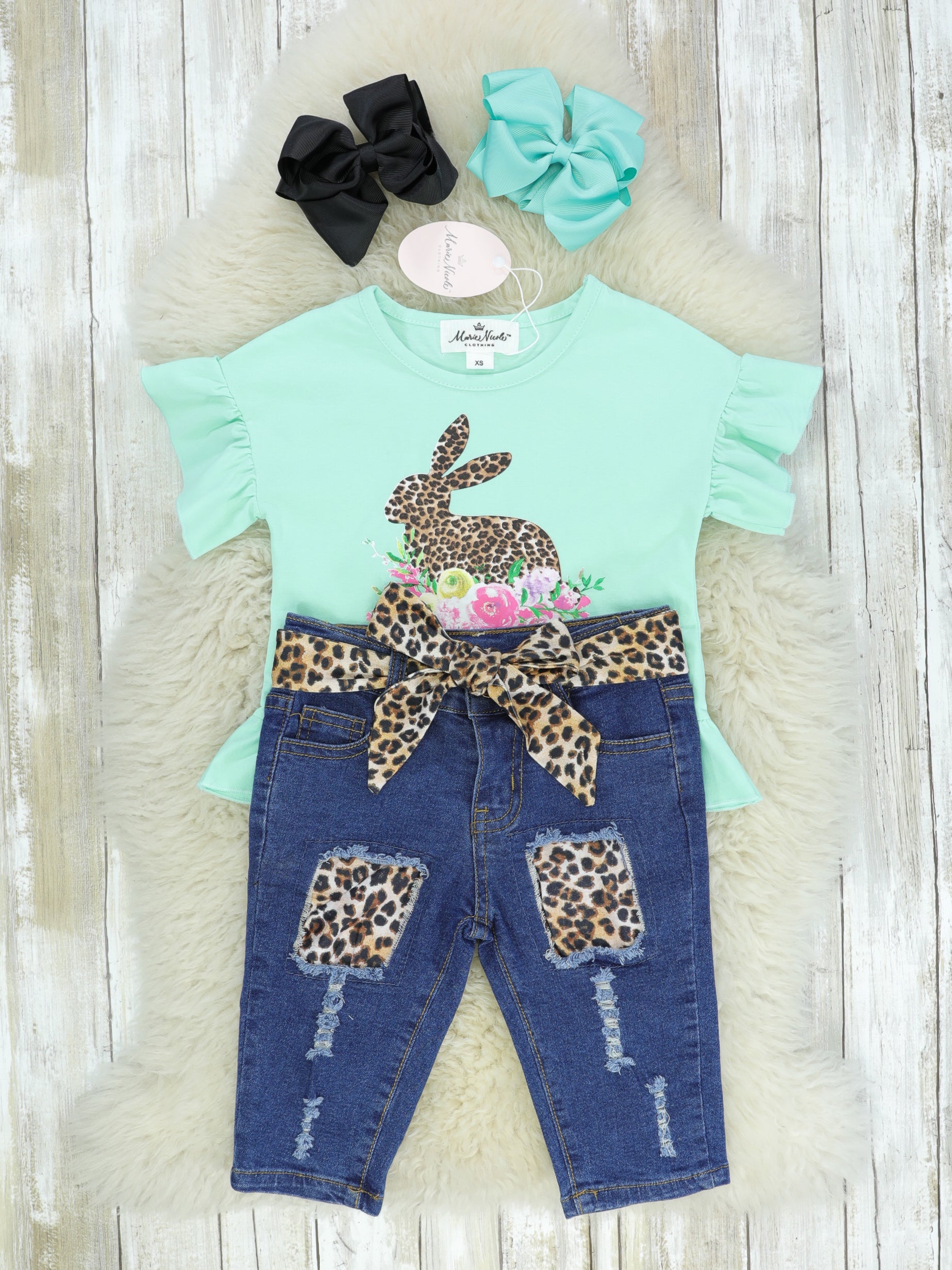 The cutest bunny on the block! This outfit features a mint top with ruffles & a leopard bunny floral detail; the bottoms are fairly distressed with matching leopard patches & an adjustable leopard tie around the waist.