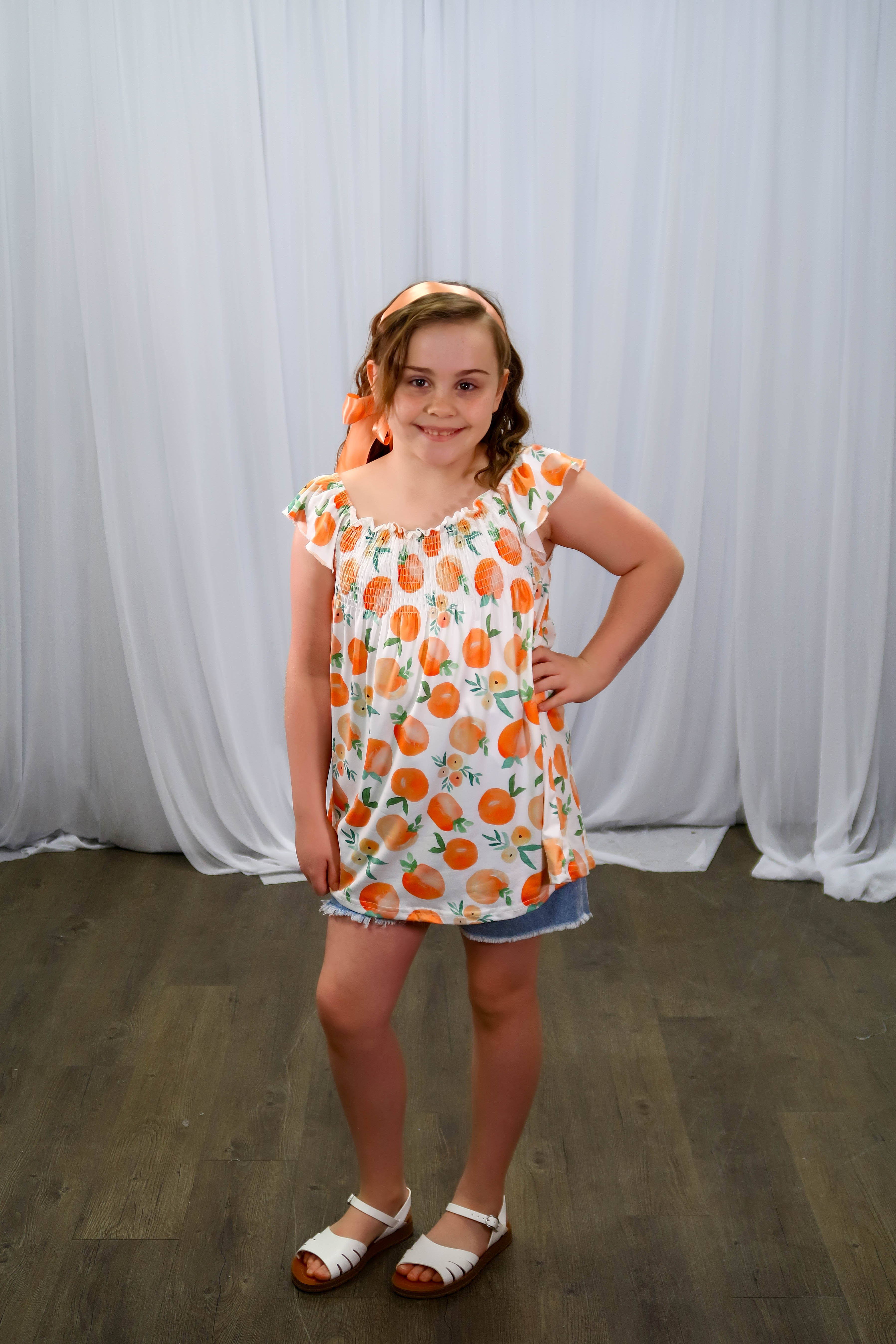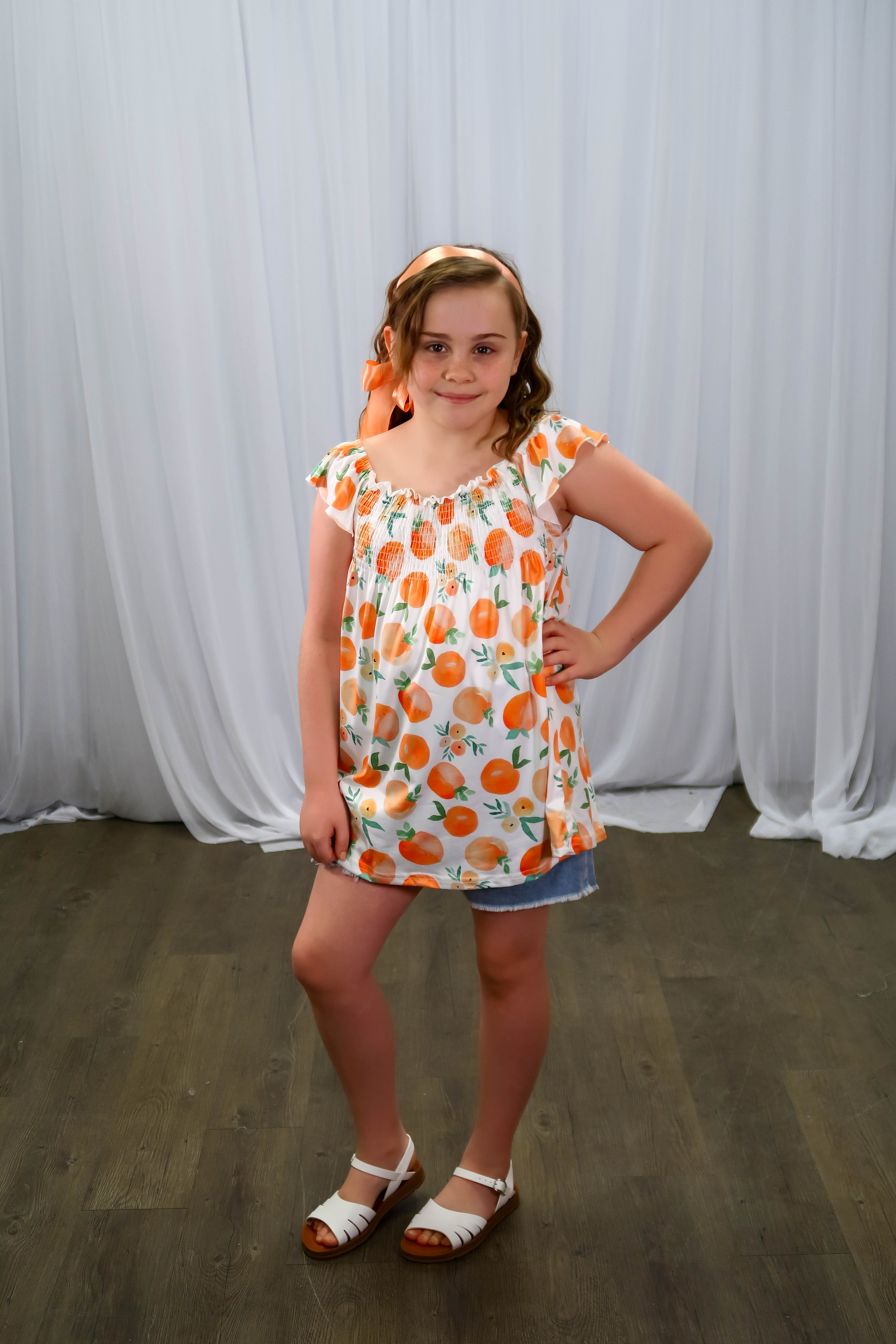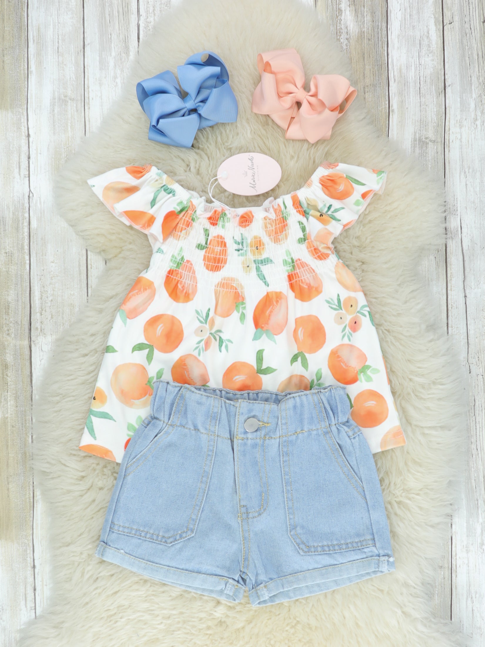 A cute, casual outfit for a warm Summer day! This outfit features a white top that can be worn on or off the shoulder with a smocked detail and mandarin orange details; the light wash denim shorts feature pockets, a functional button and zipper, and an adjustable elastic waistband with buttons.