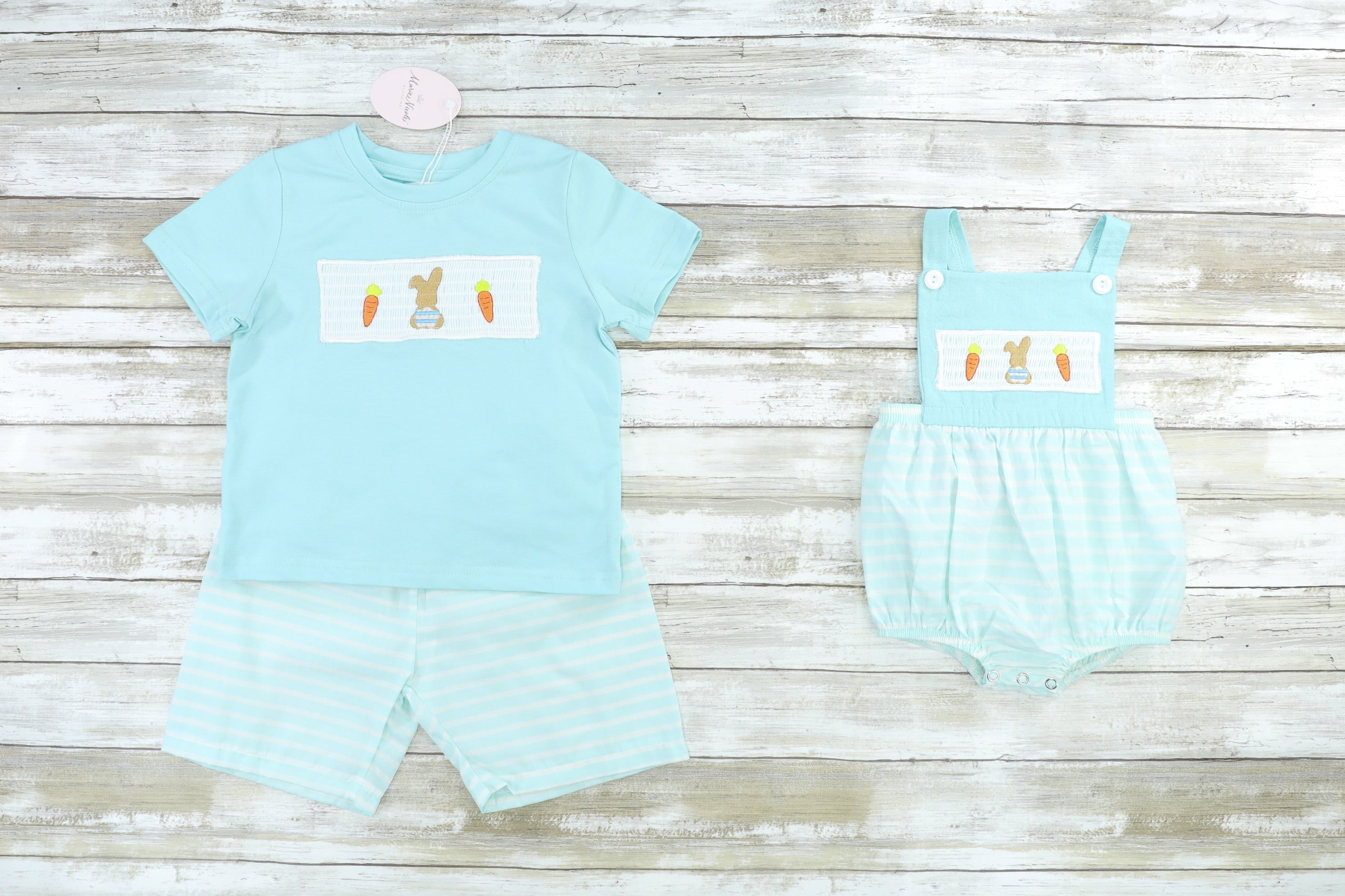 This sibling set has something for all of your littles to wear this Easter! This pink outfit features flutter sleeves, stripes, ruffles, & a bunny carrot smocked detail.