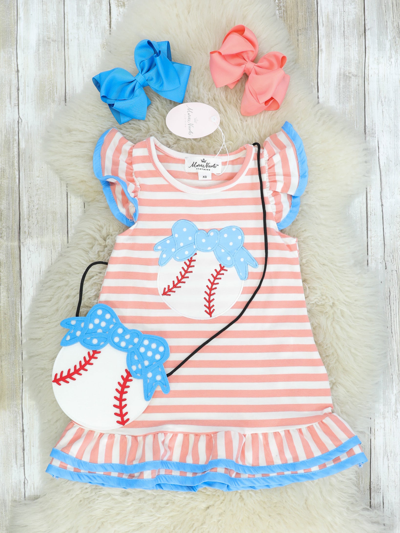 Peach Striped Ruffle Baseball Dress & Purse Set