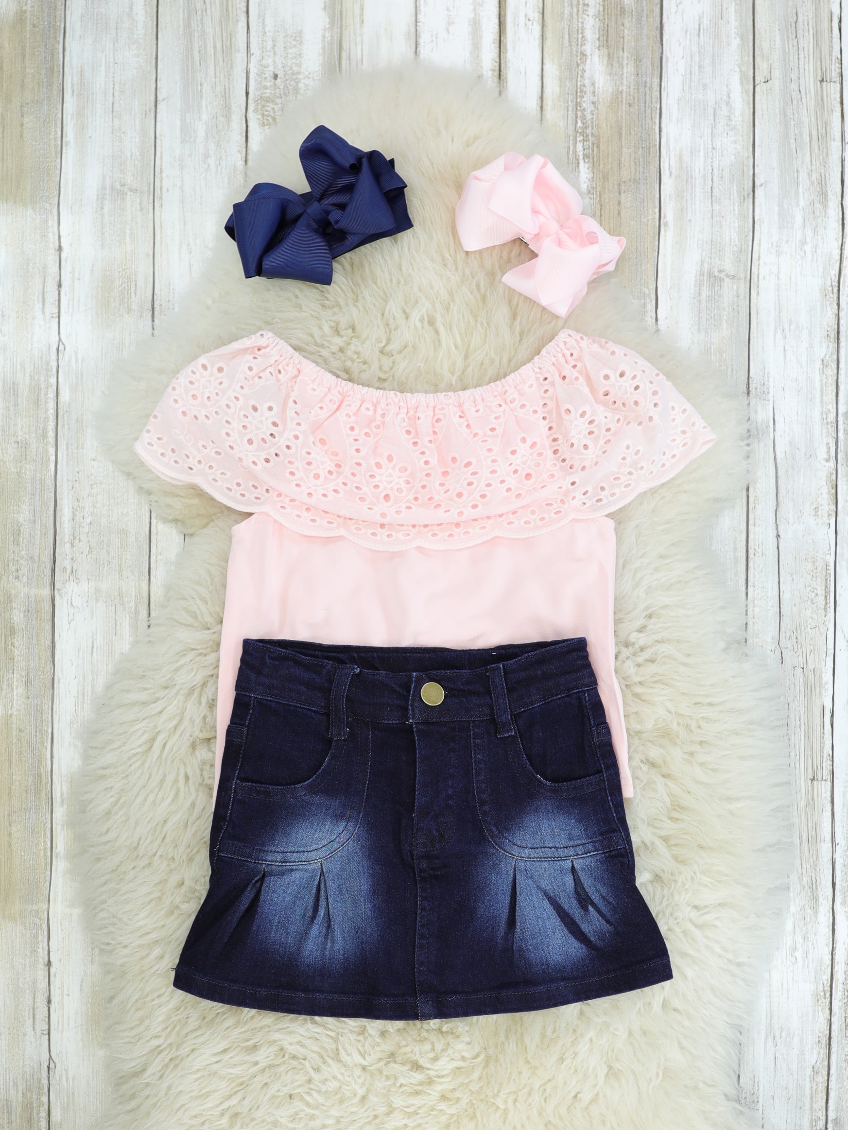 Isn't she lovely? This top features an eyelet lace double ruffle neckline and is paired with a denim pleated pocketed skirt.