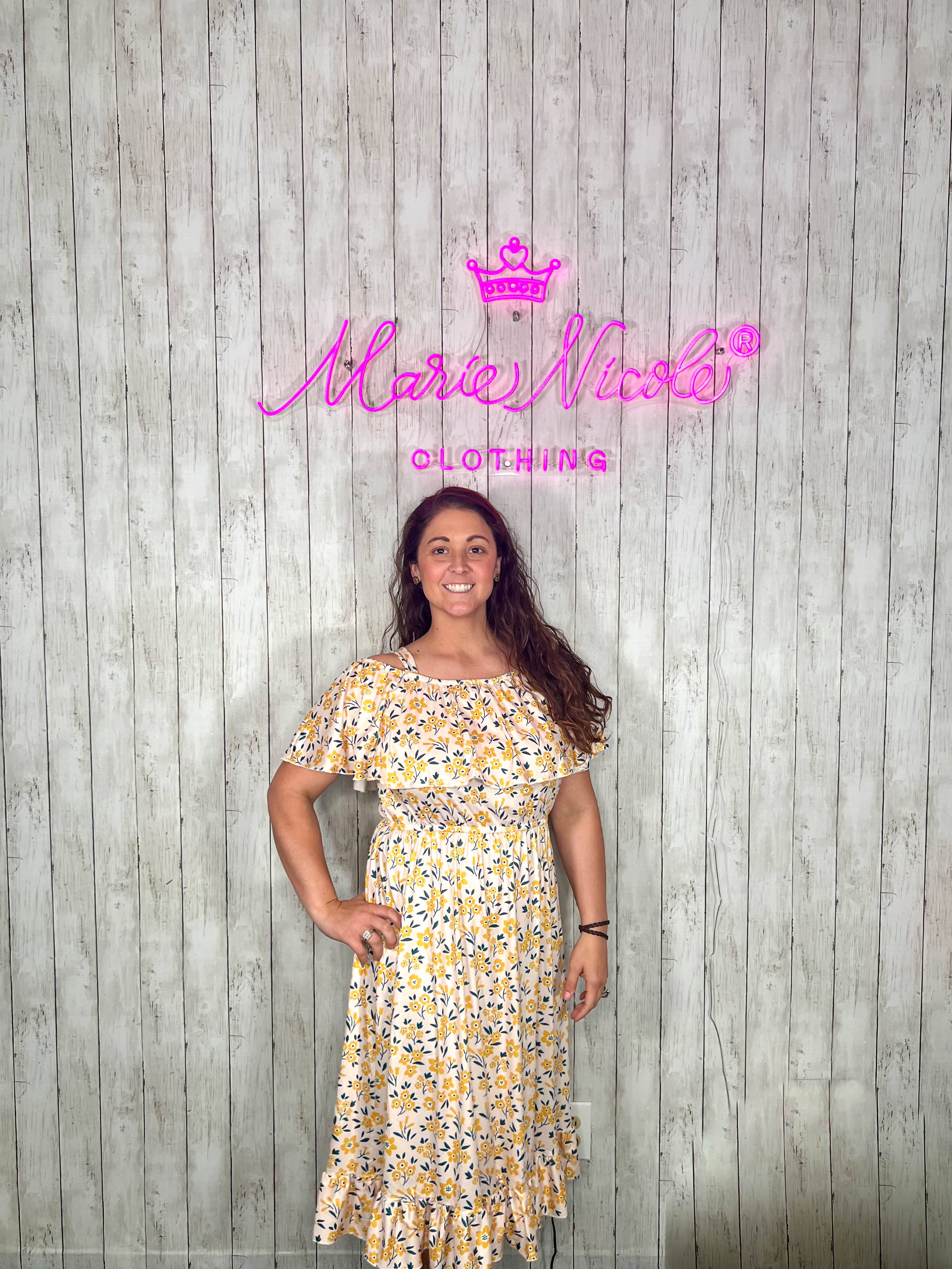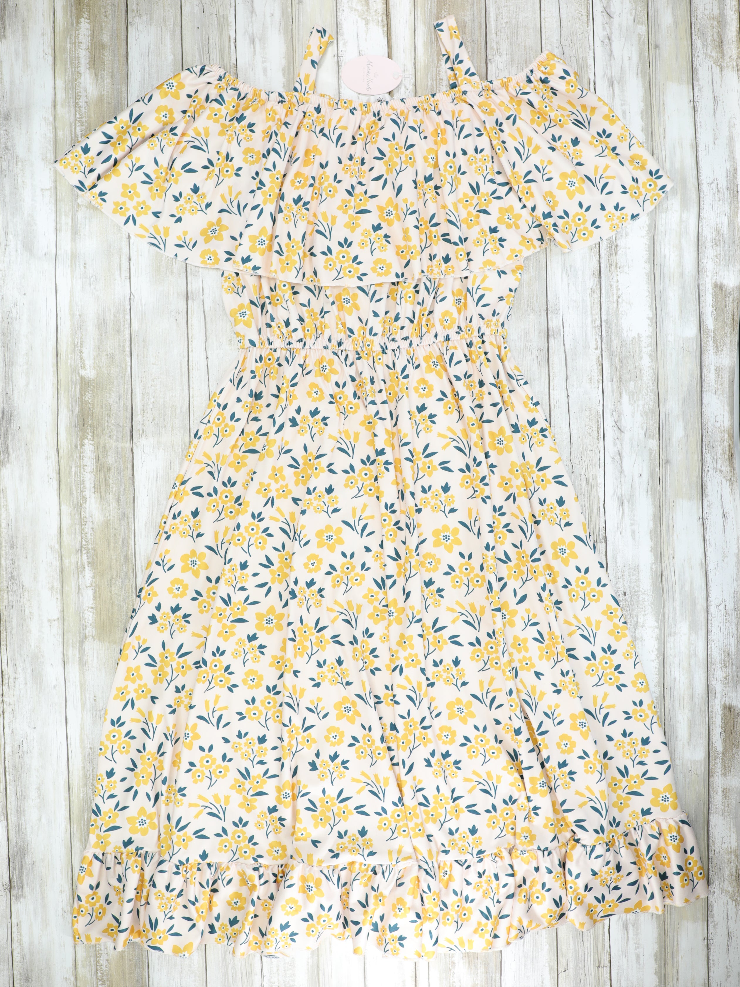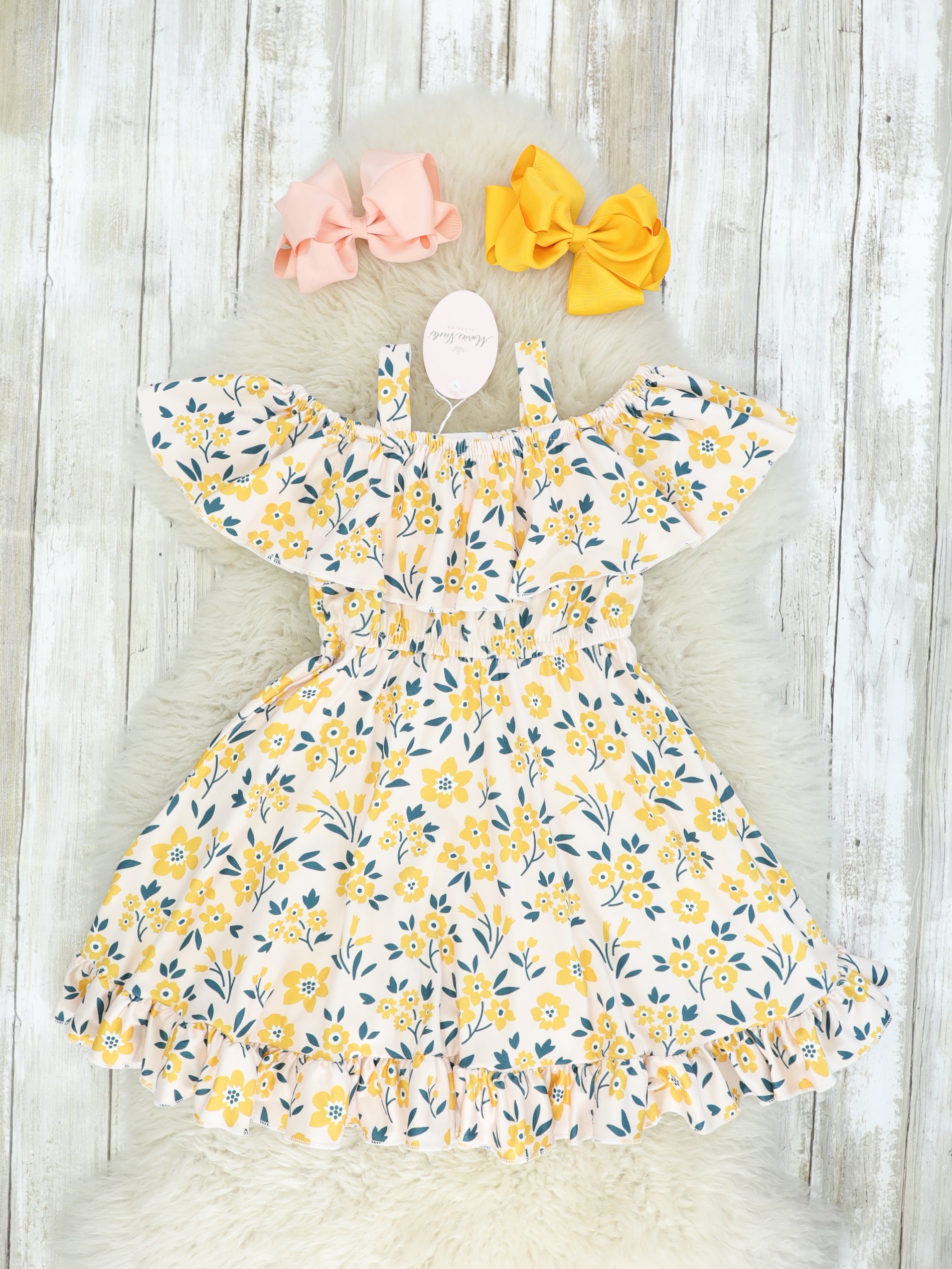 The Mom and Me set you've been waiting for. Perfect for tea parties and shopping days. These dresses have a yellow and green floral print, off the shoulder neckline with overlapping ruffle, elastic waist and ruffle hem.
