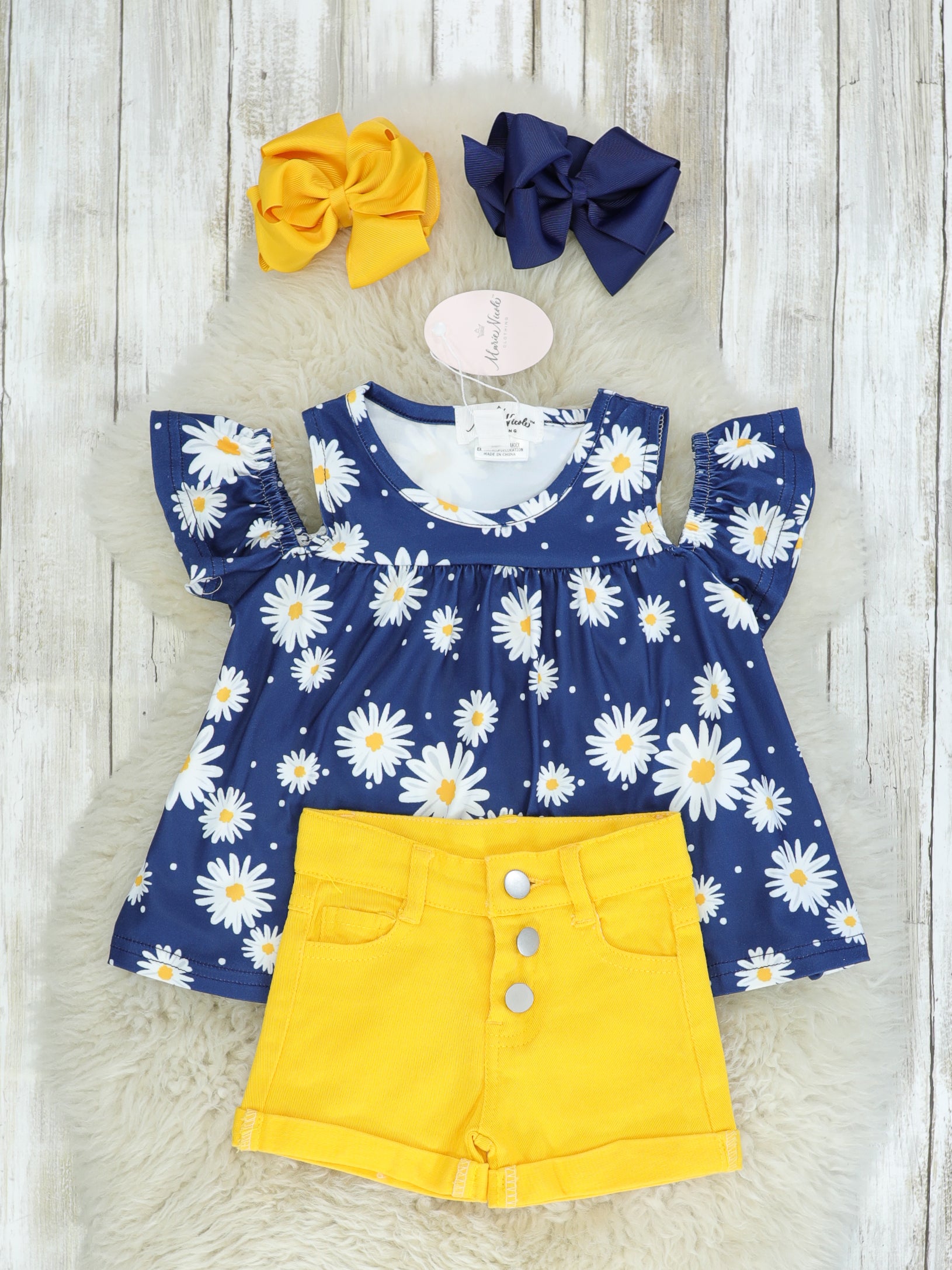 Simple and sweet in this adorable daisy outfit! This top features a daisy floral print with cold shoulder details and matching yellow shorts with a button fly.