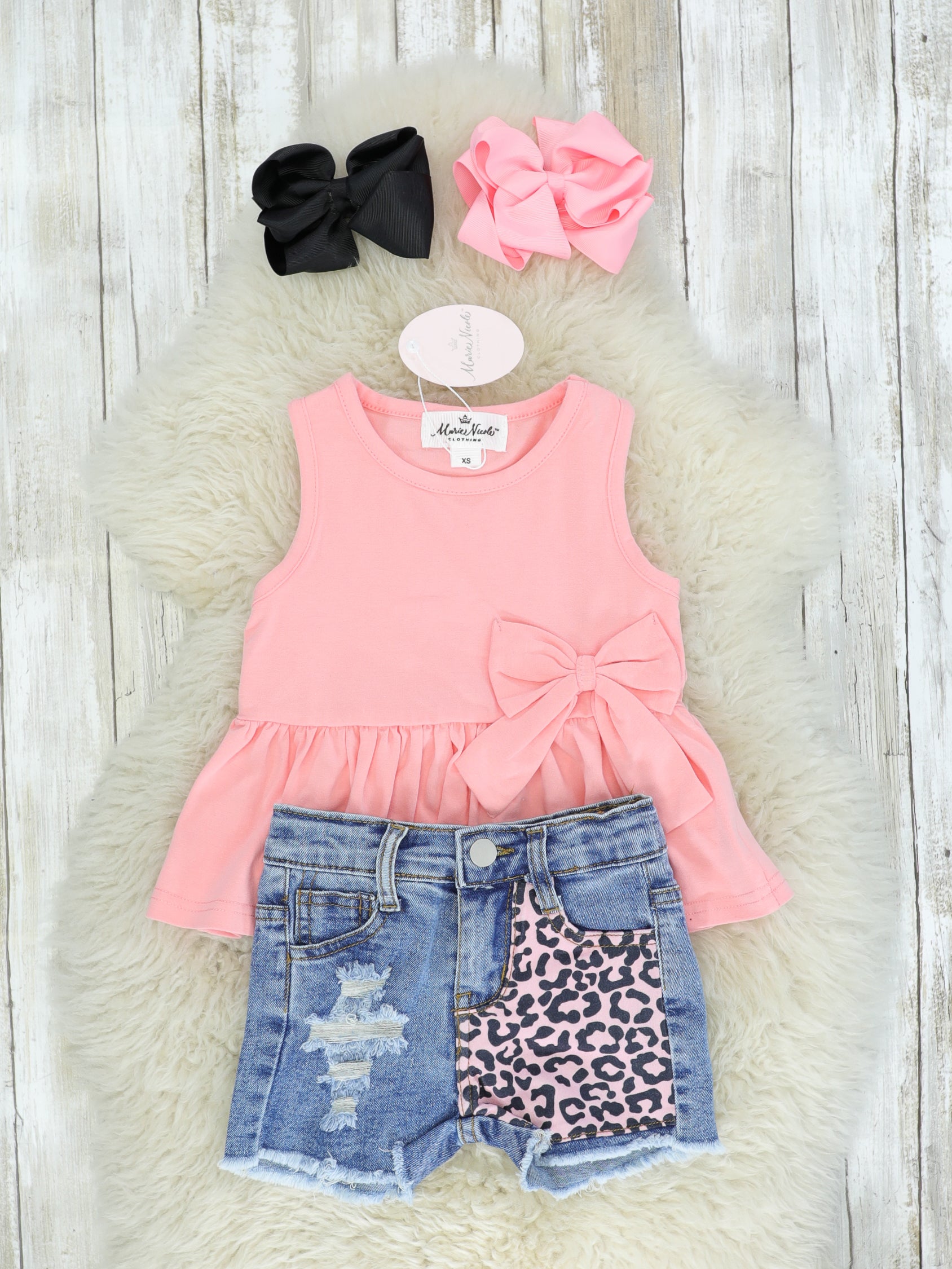 Pretty in pink in this adorable tank and short outfit. This top features a pink bow with ruffle hem and distressed shorts with leopard patchwork.