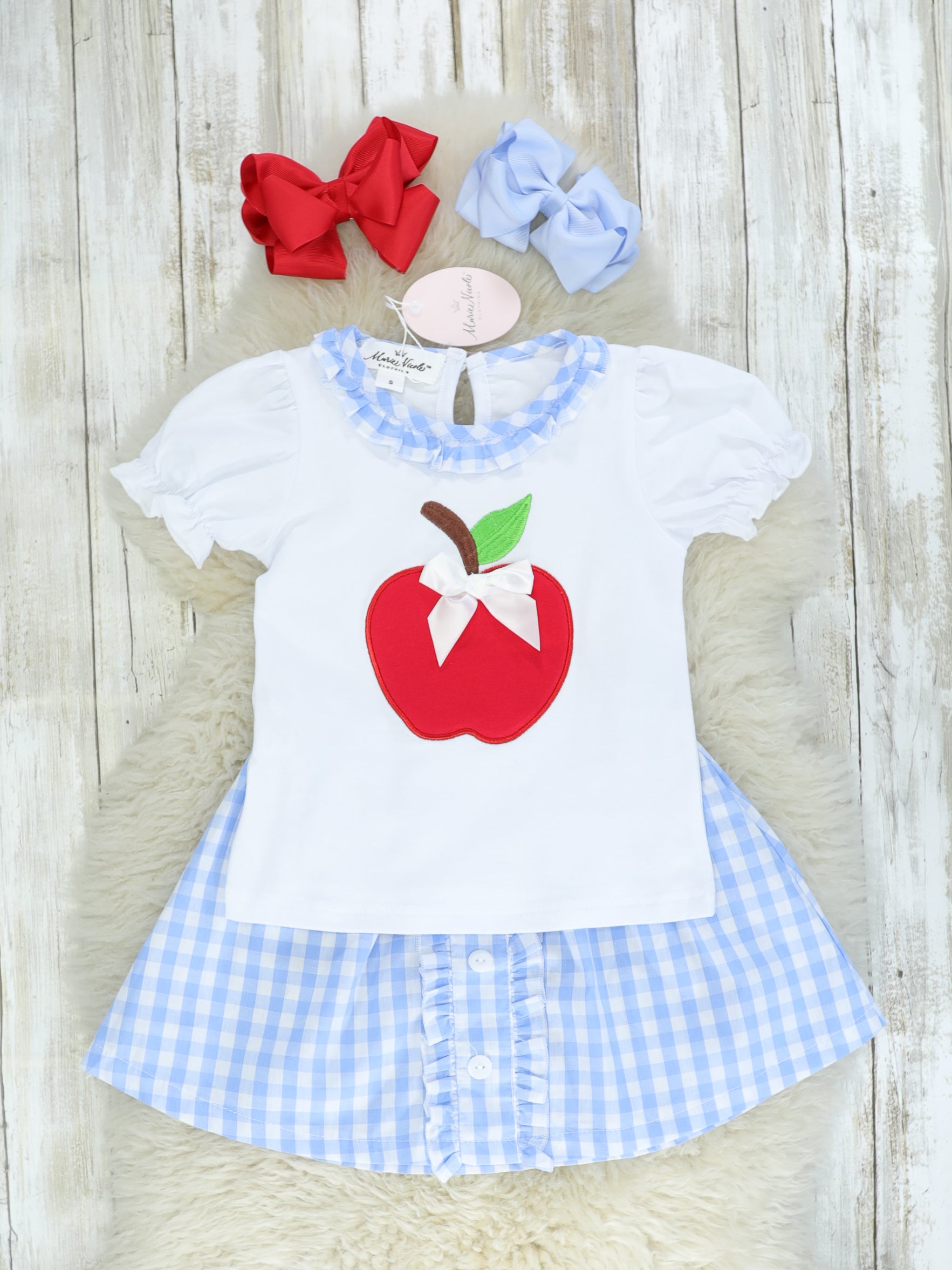 Check off your back to school wardrobe with this adorable top and skirt outfit. Featuring an apple appliqué, puff sleeves, blue and white check ruffle neckline and matching blue and white check ruffle button skirt.