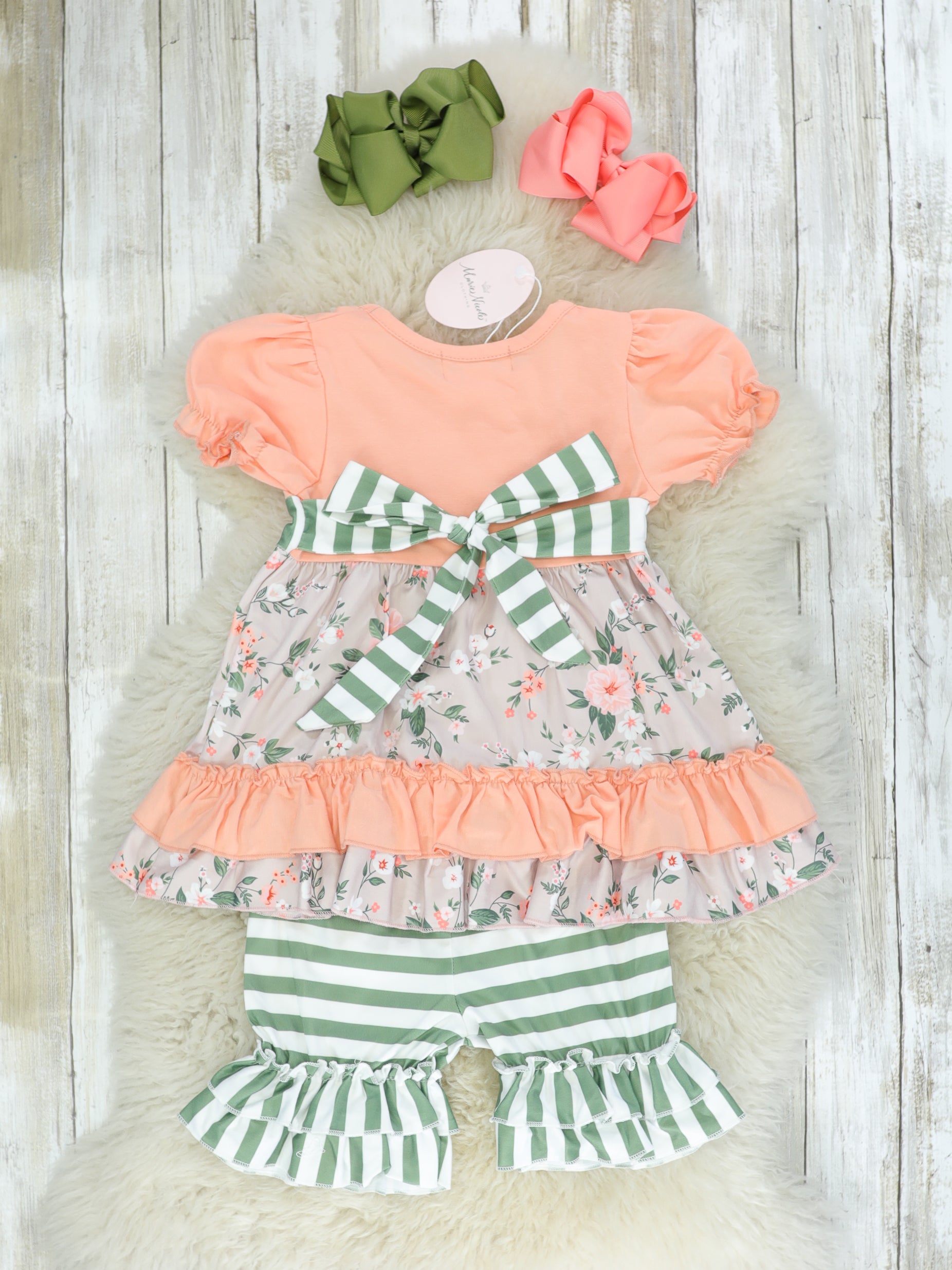 Always make time to stop and smell the flowers! This sister set is so stinkin' cute, it features a ruffle hem and green and white striped adjustable tie belt and matching ruffle shorts.