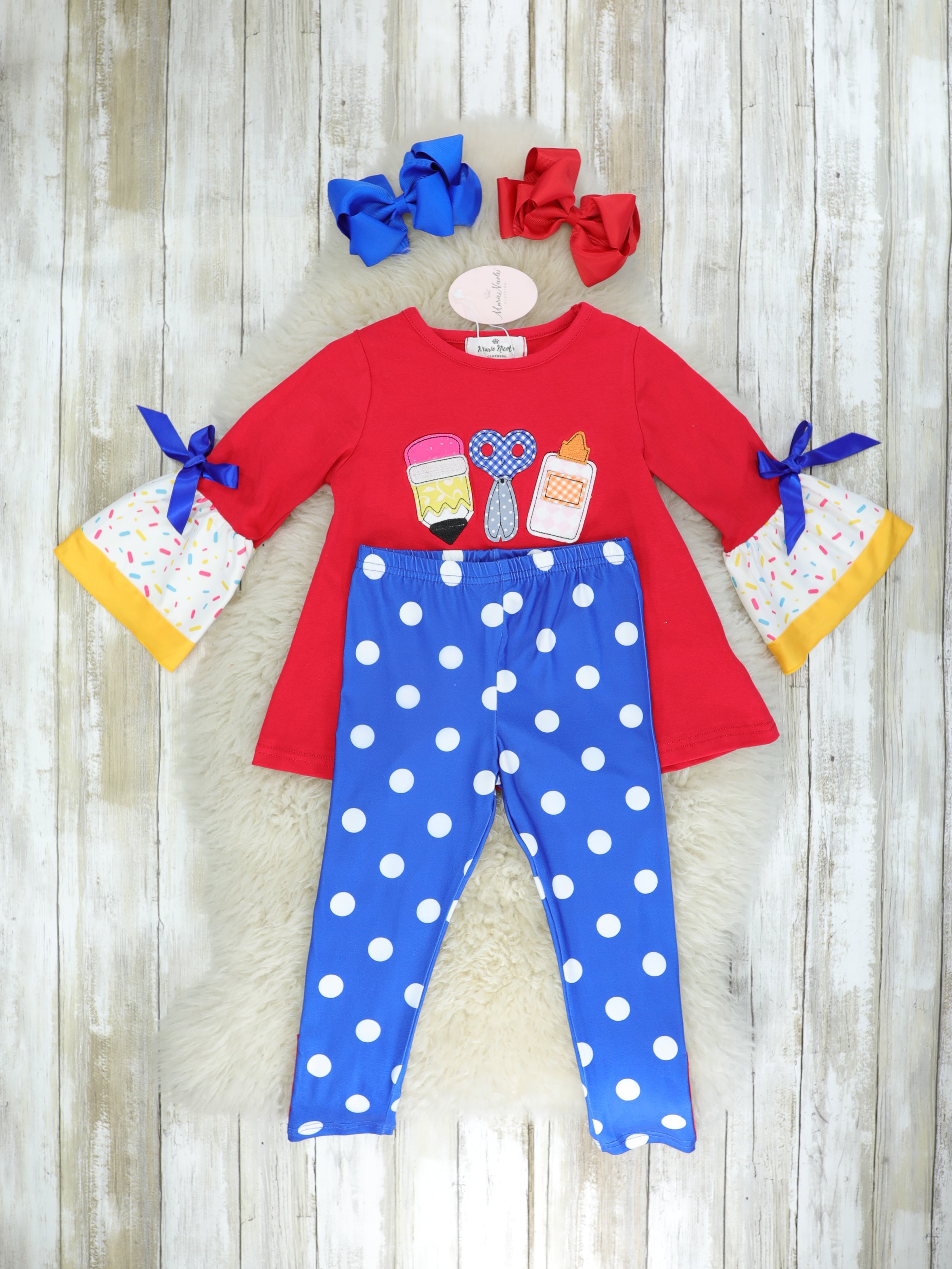 Learning has no limits and your style doesn't have to either! We are in love with this school supplies sibling set. Featuring a pencil, scissors and glue appliqué, bell sleeves with sprinkles and bows and polka pants in blue and white.