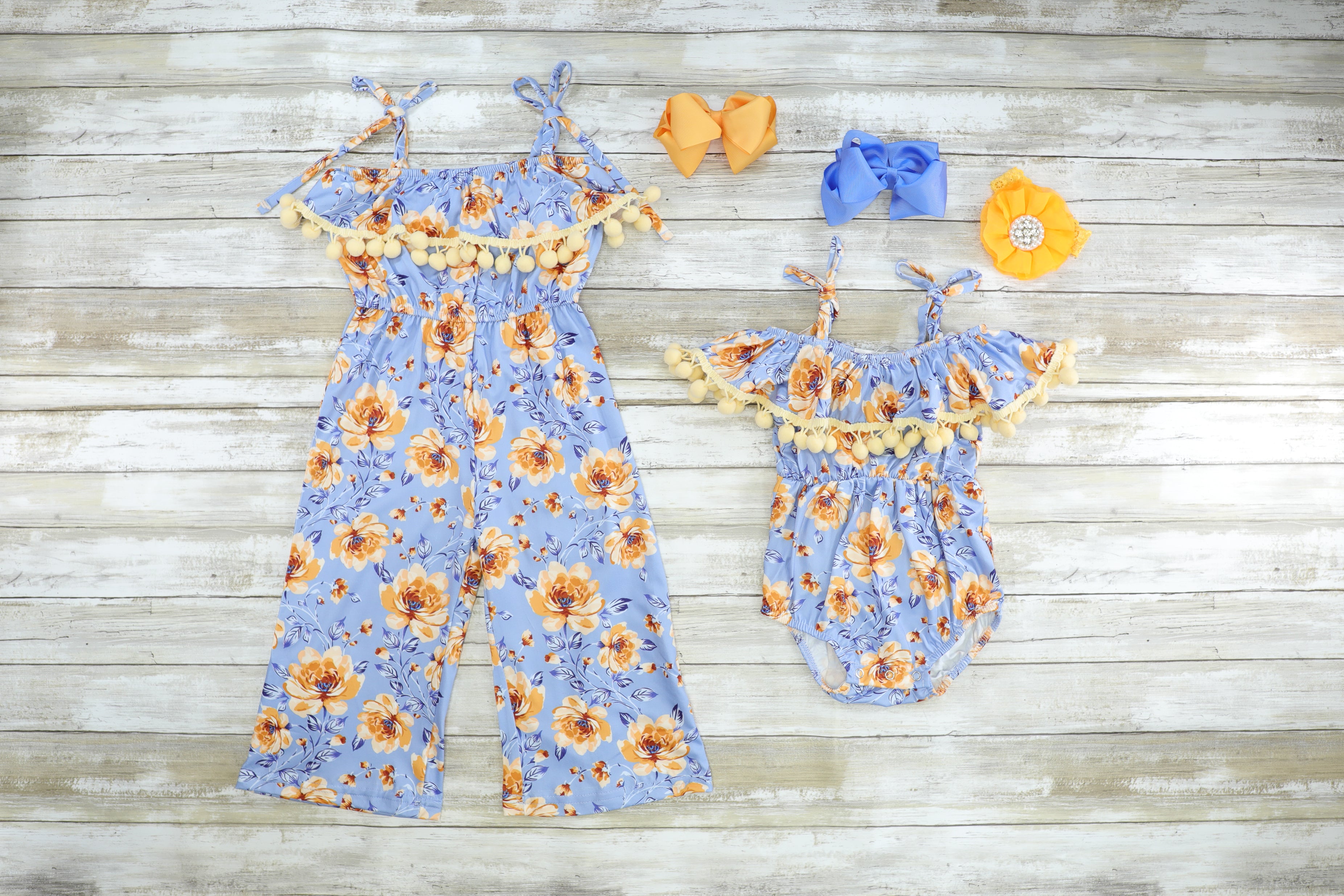This sister set is a fun summer outfit for any playdate! Featuring an all over floral pattern, functional tie straps and yellow pom pom trim.