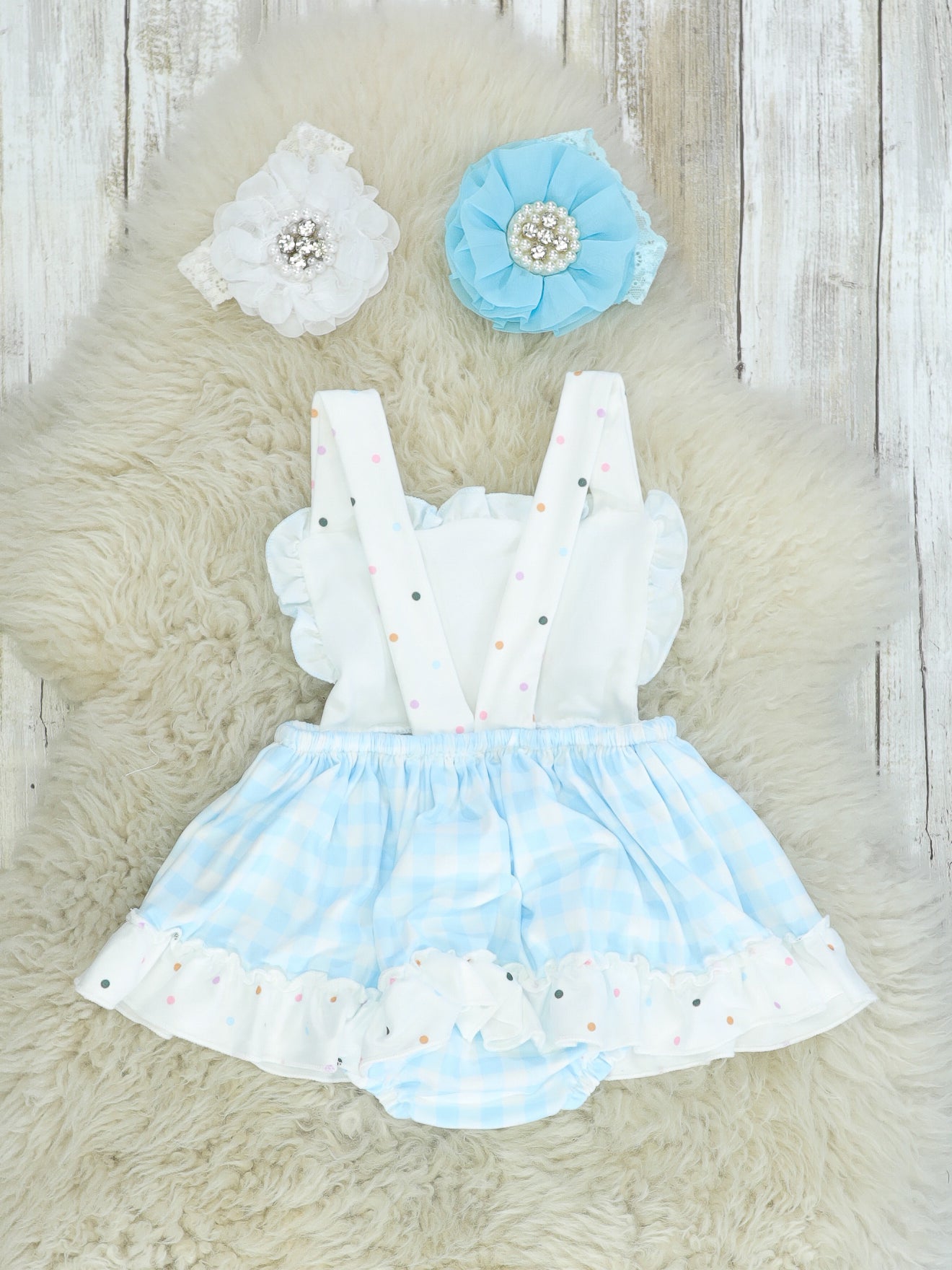 Be a rainbow in someone else's cloud in this cute sister set! Featuring a multi color rainbow, blue and white check print, contrasting polka dot print with pom pom and ruffle details.