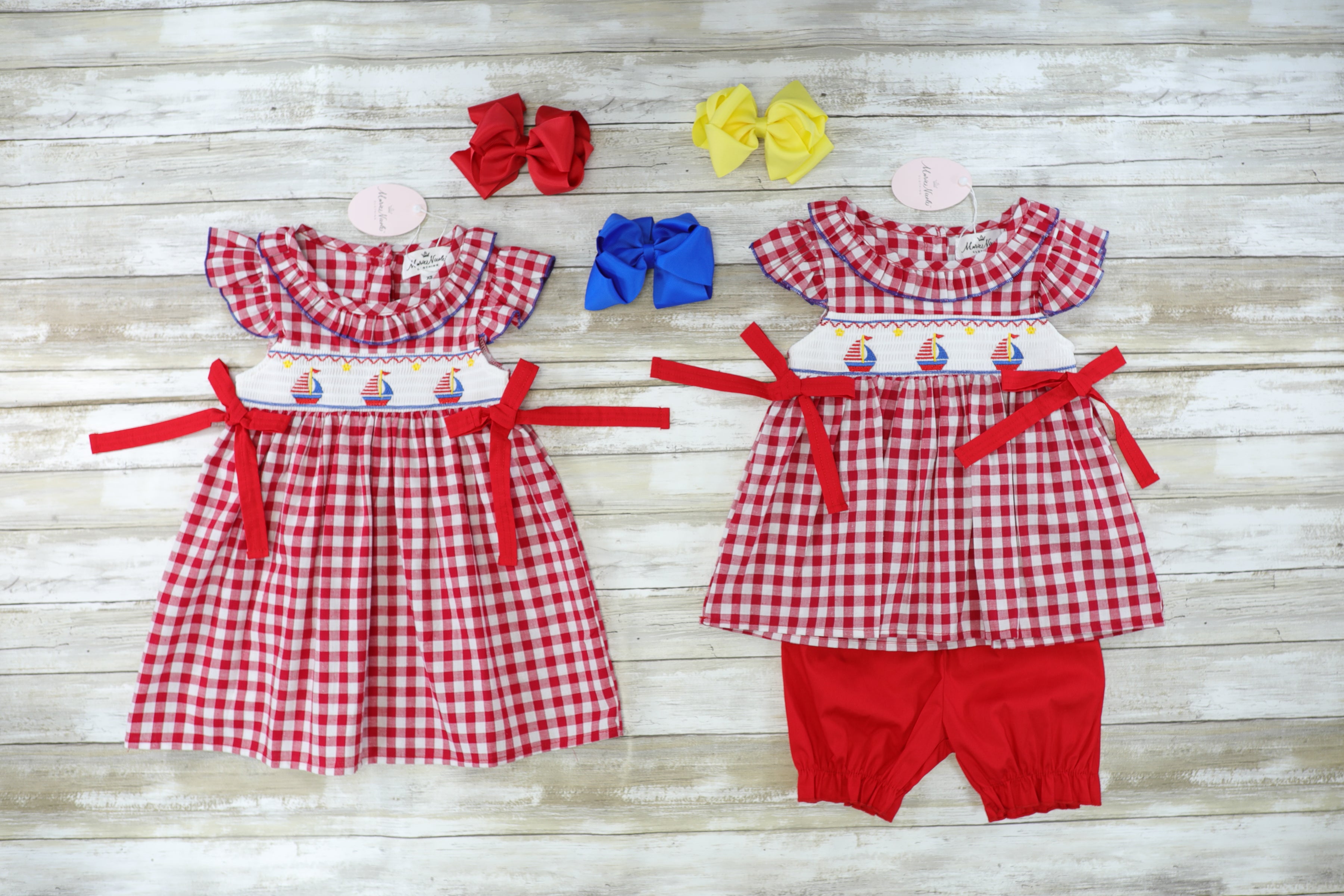 Sail away for the Summer in this gorgeous gingham sister set! This red & white gingham swing dress features ruffles, smocking with sailboat appliqués, & nonfunctional ribbon bows.