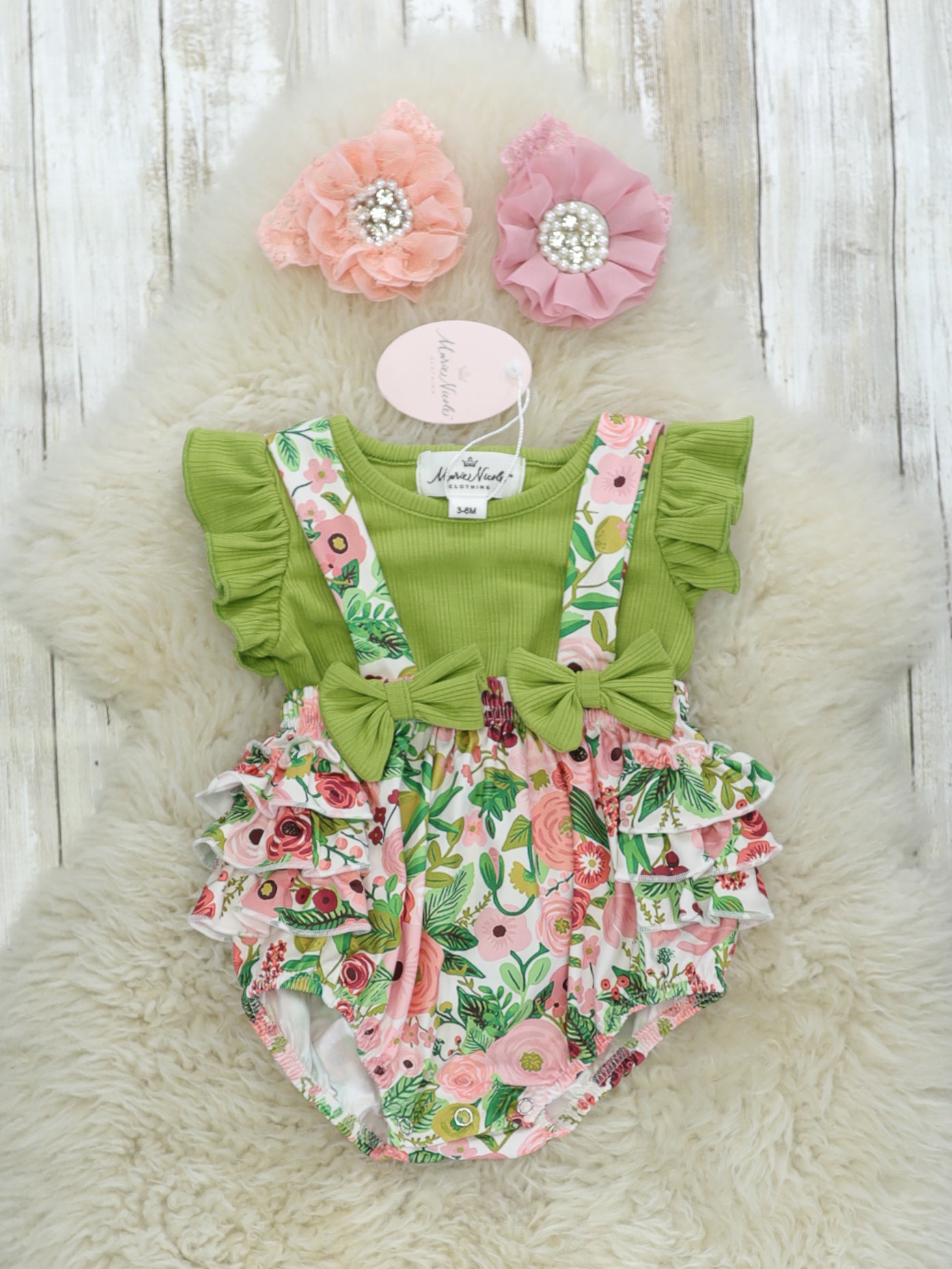 Green Ruffle Top & Floral Ruffle Overall Set