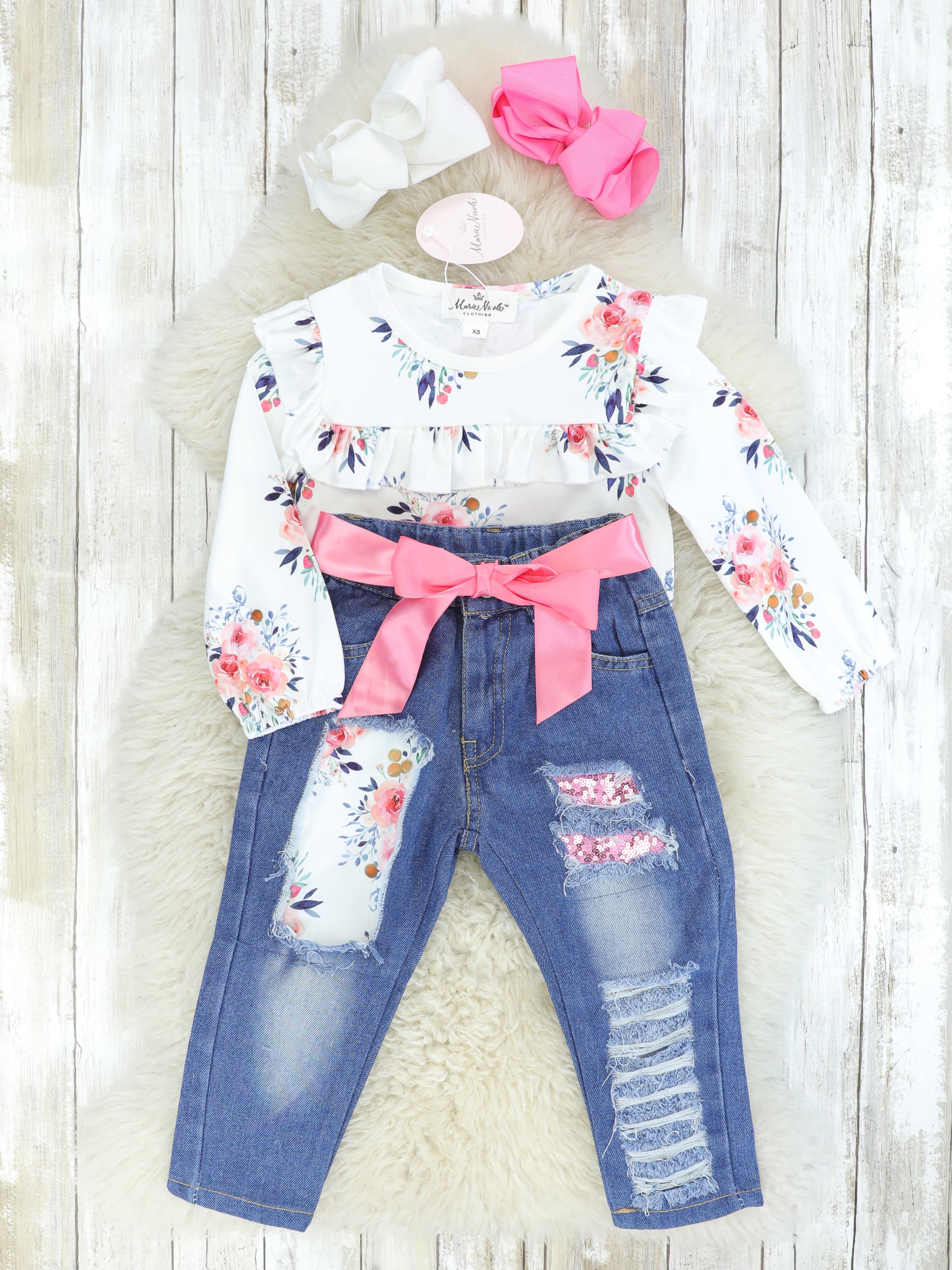 We love pink, sparkles, & florals! This outfit features a light pink floral flutter trim top & distressed denim pants with a matching floral patch, sequin details & a ribbon belt.