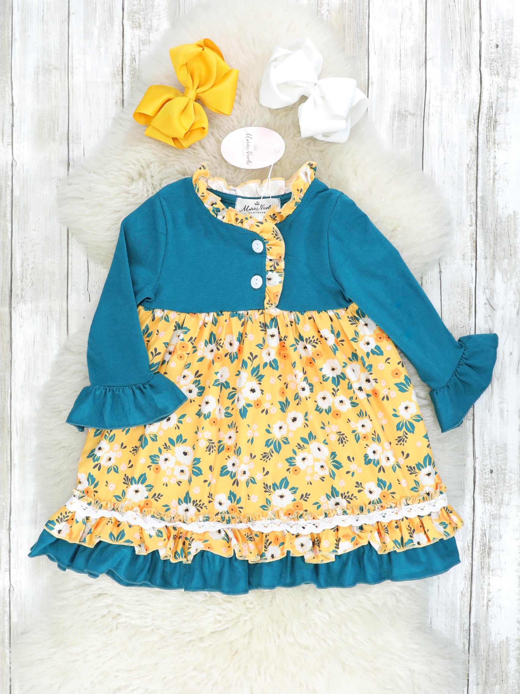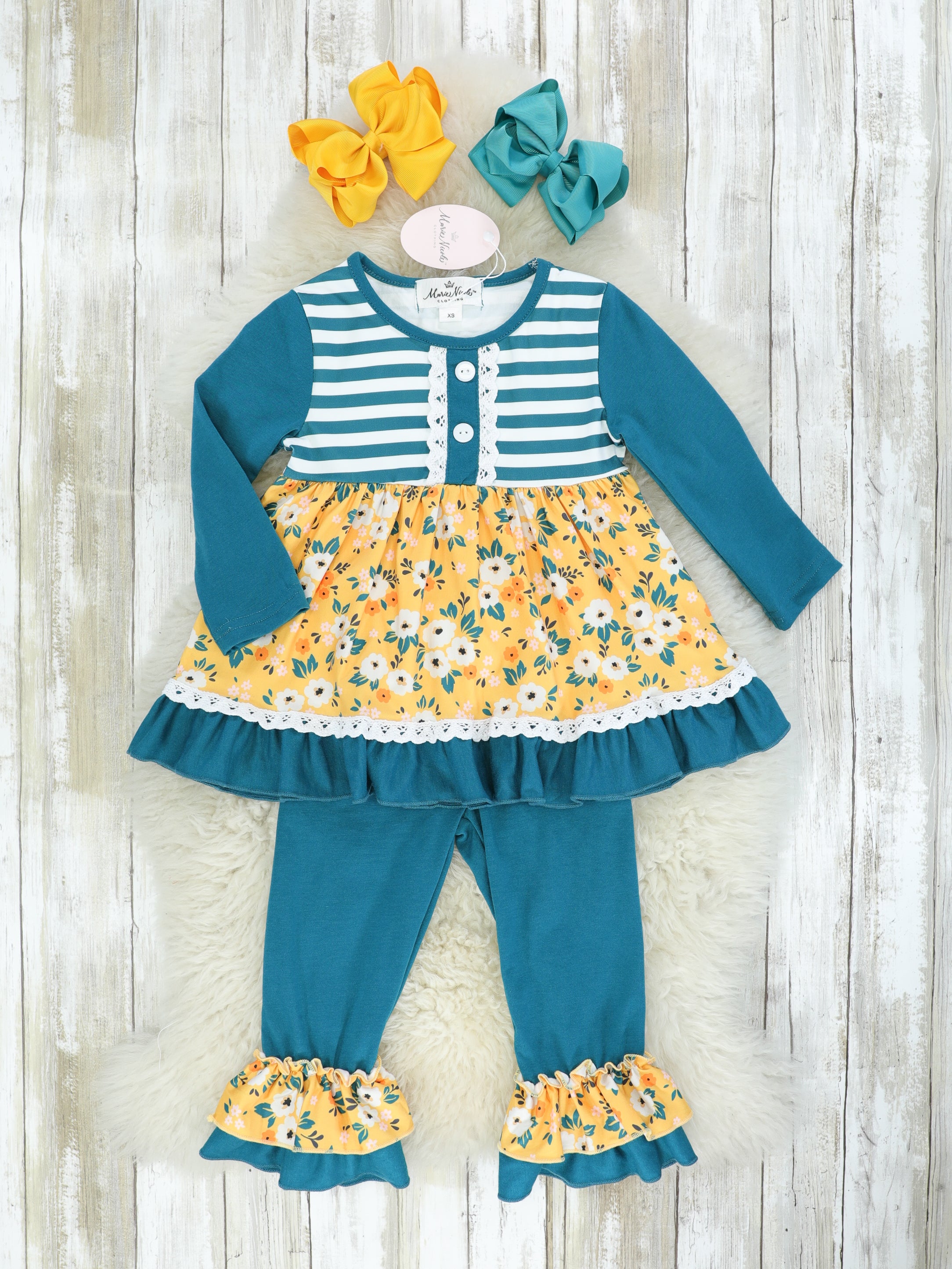 Yellow Ruffle Top & Shabby Chic Chicken Print Bottoms W/ Scarf