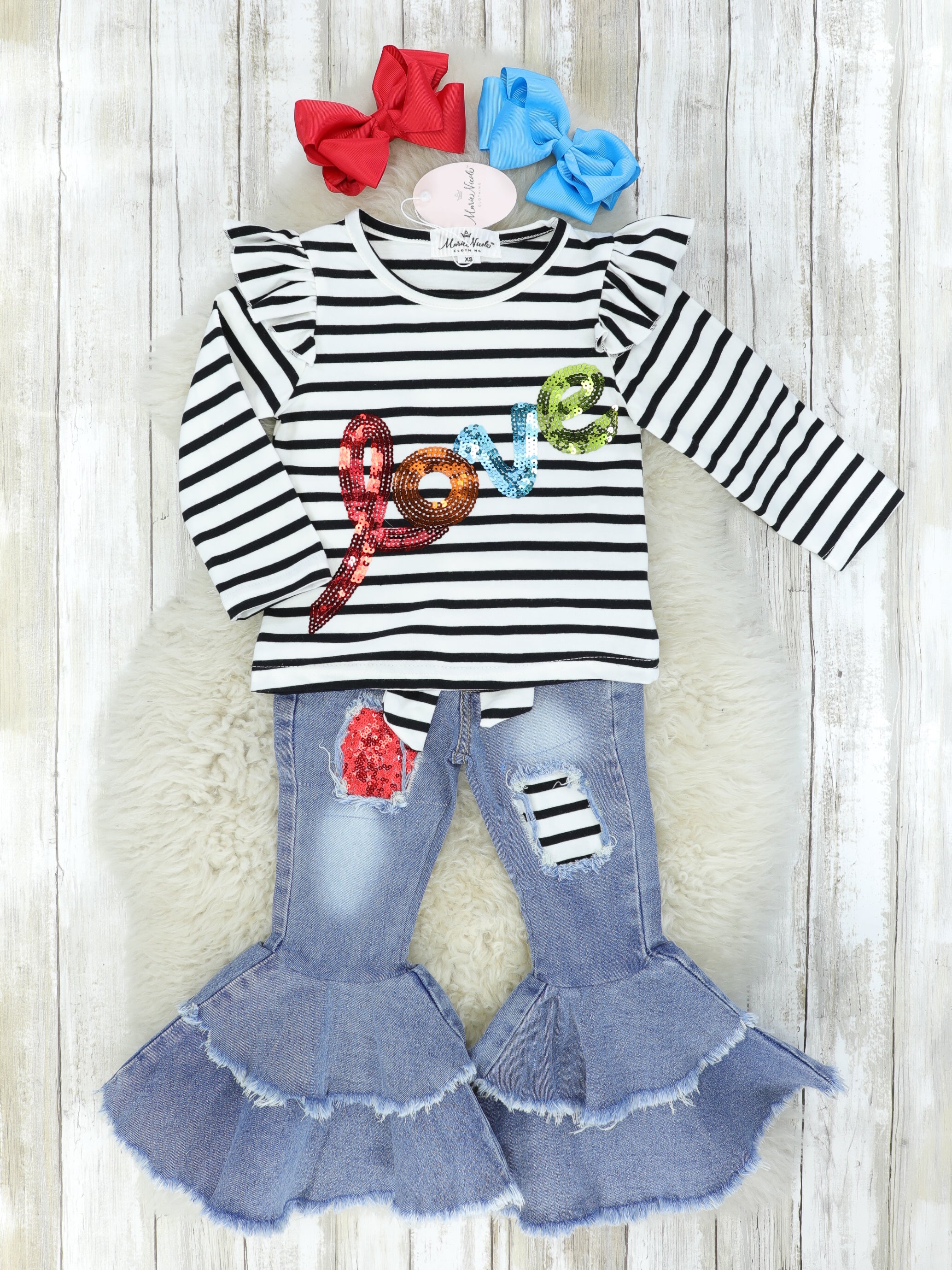 Striped "Love" Sequin Ruffle Top & Denim Bell Bottoms Outfit
