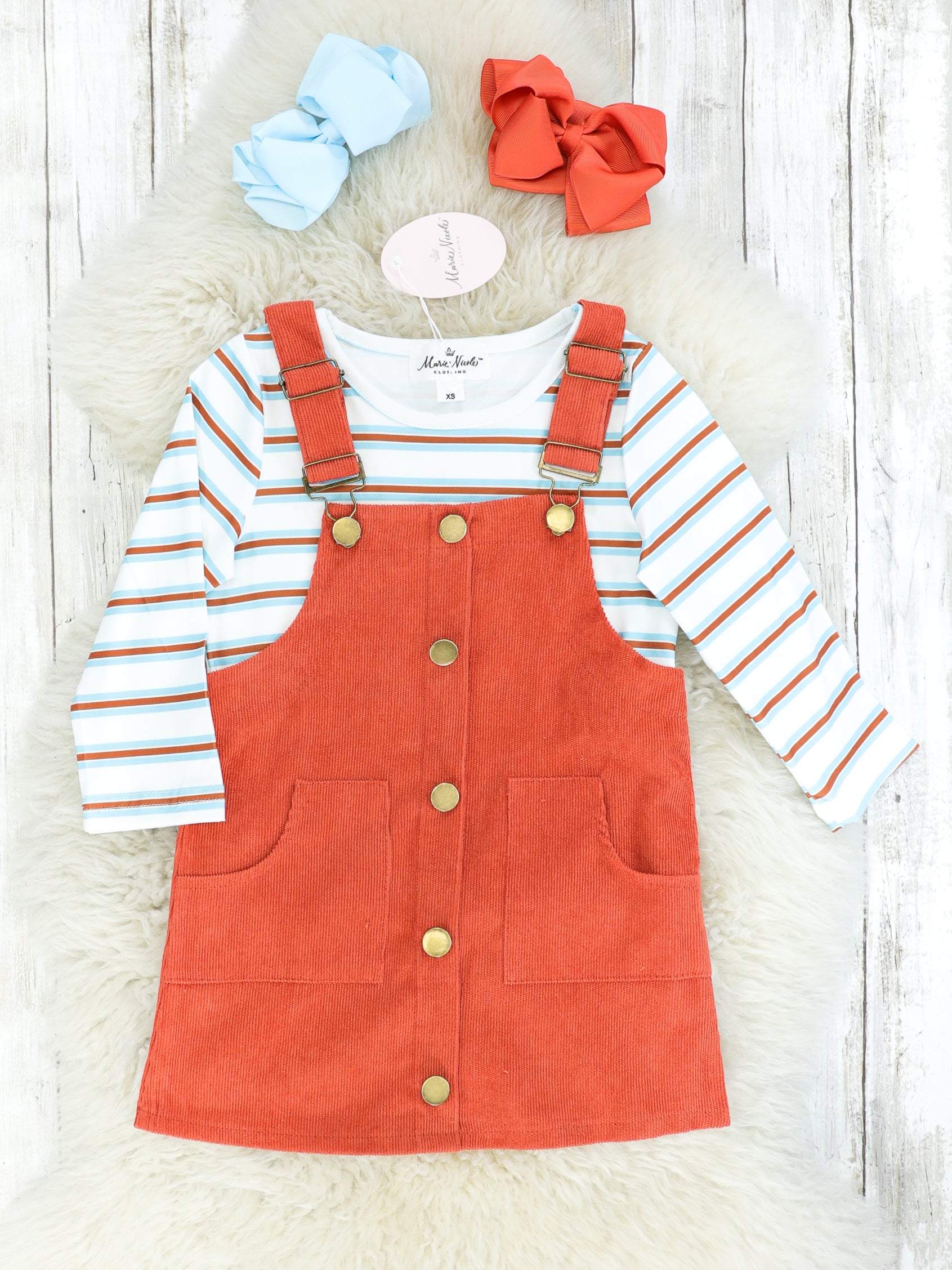 Striped Long Sleeve Top & Pocket Overall Dress Outfit