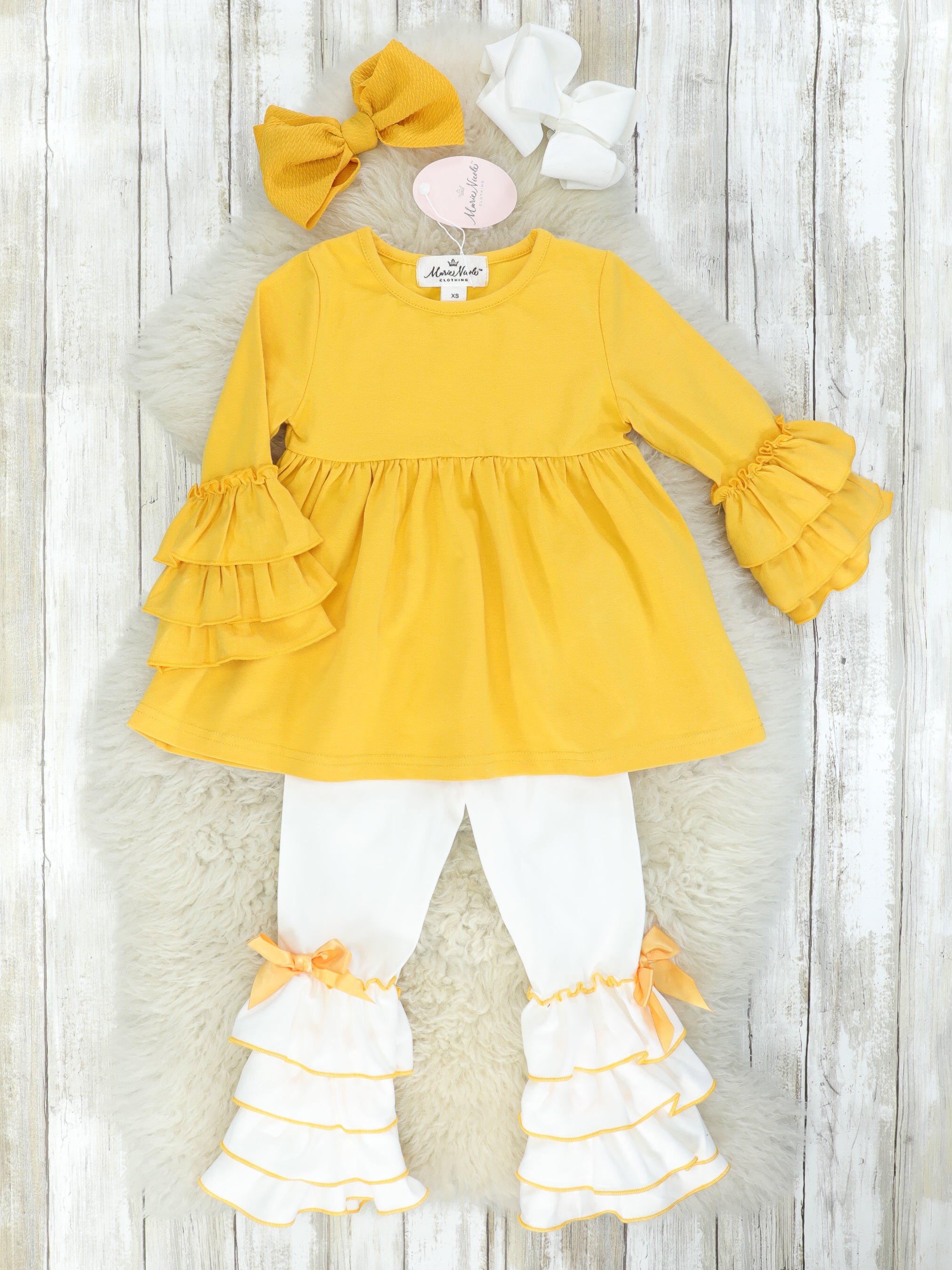 Mustard Ruffle Sleeve Peplum Top & White Bottoms Outfit