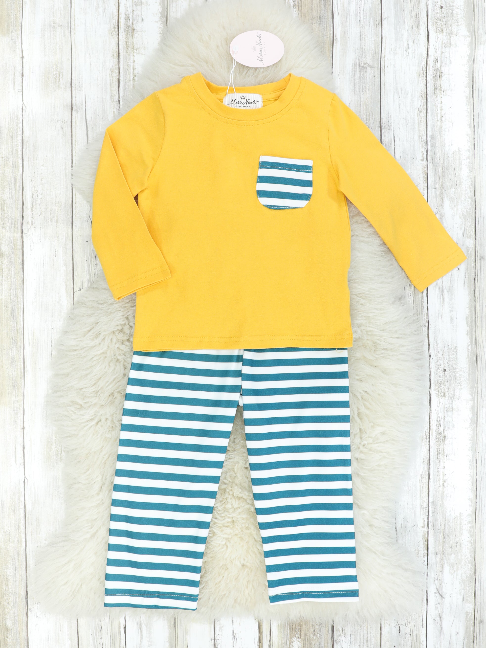 Yellow Pocket Long Sleeve & Striped Bottoms Outfit
