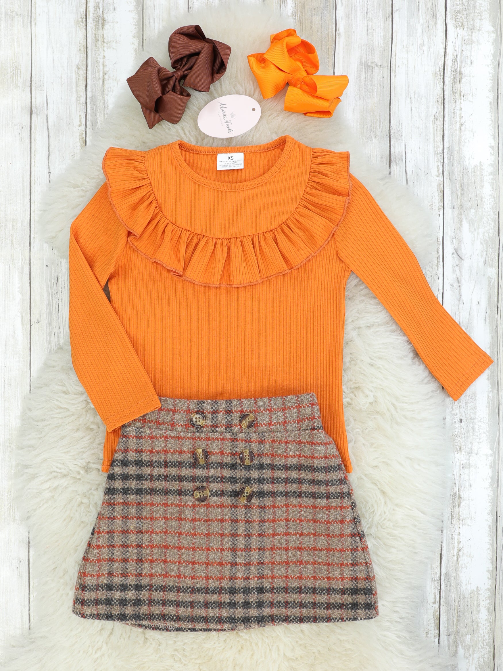 Orange Ribbed Ruffle Top & Plaid Skirt Outfit