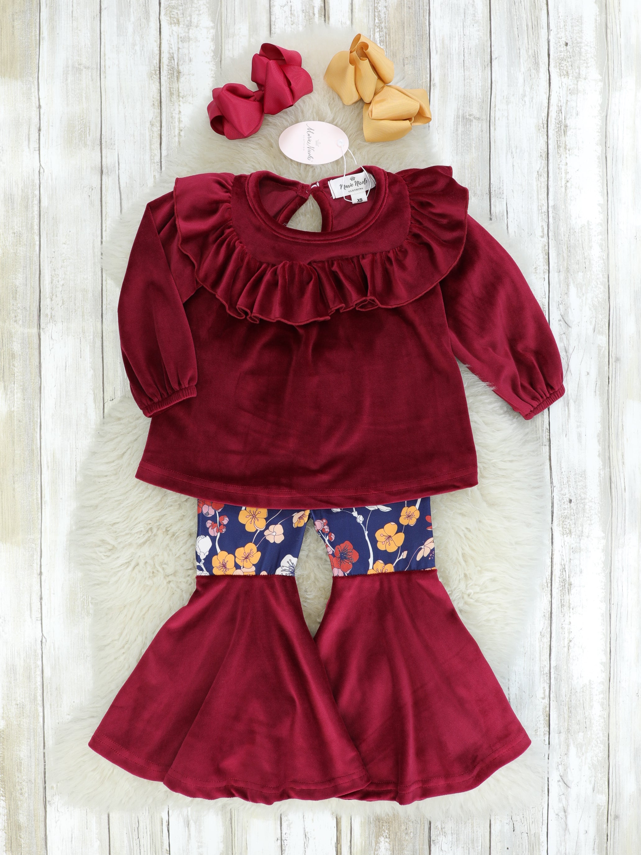 Burgundy Velvet Ruffle Top & Navy Floral Bell Bottoms Outfit