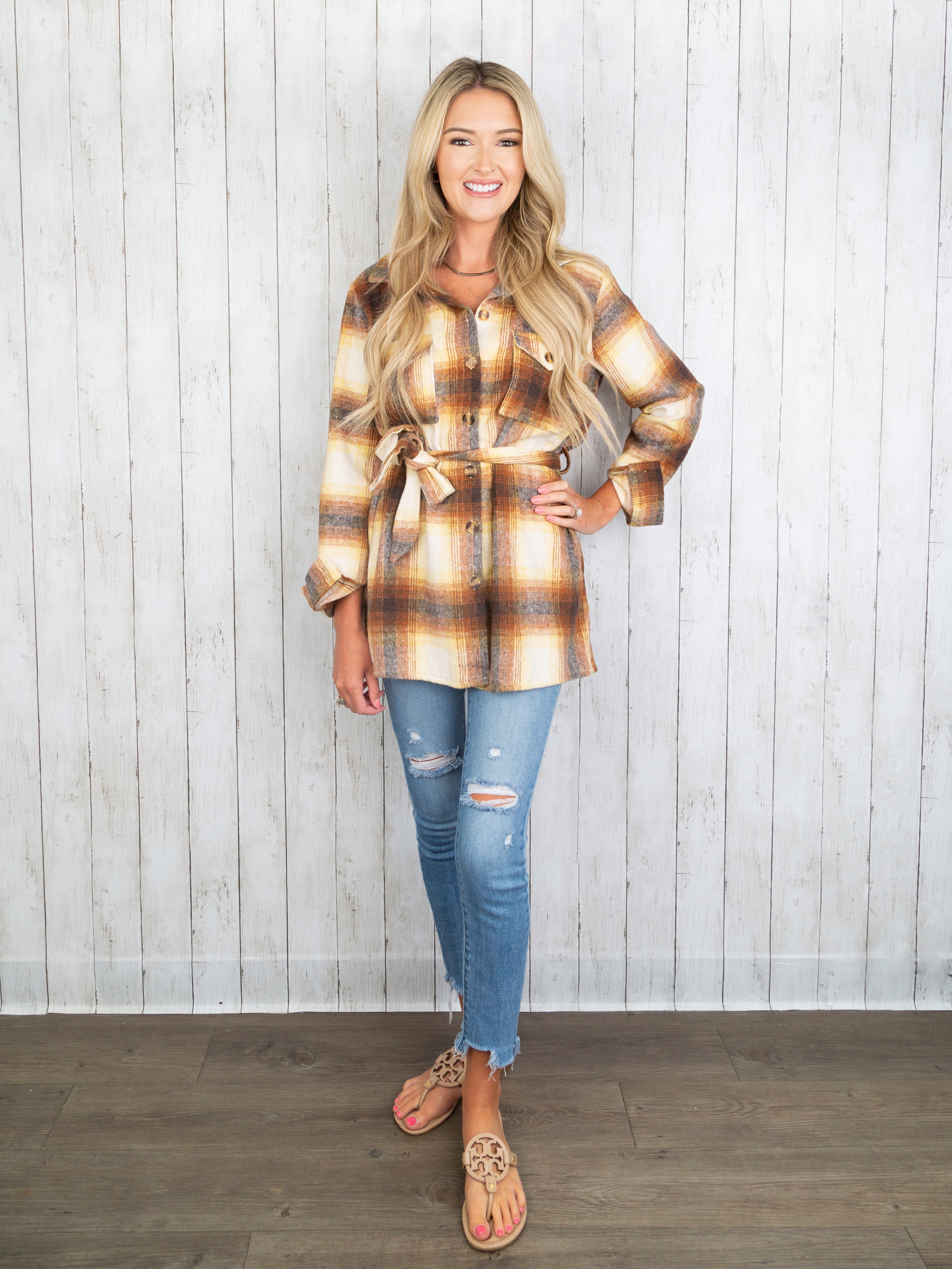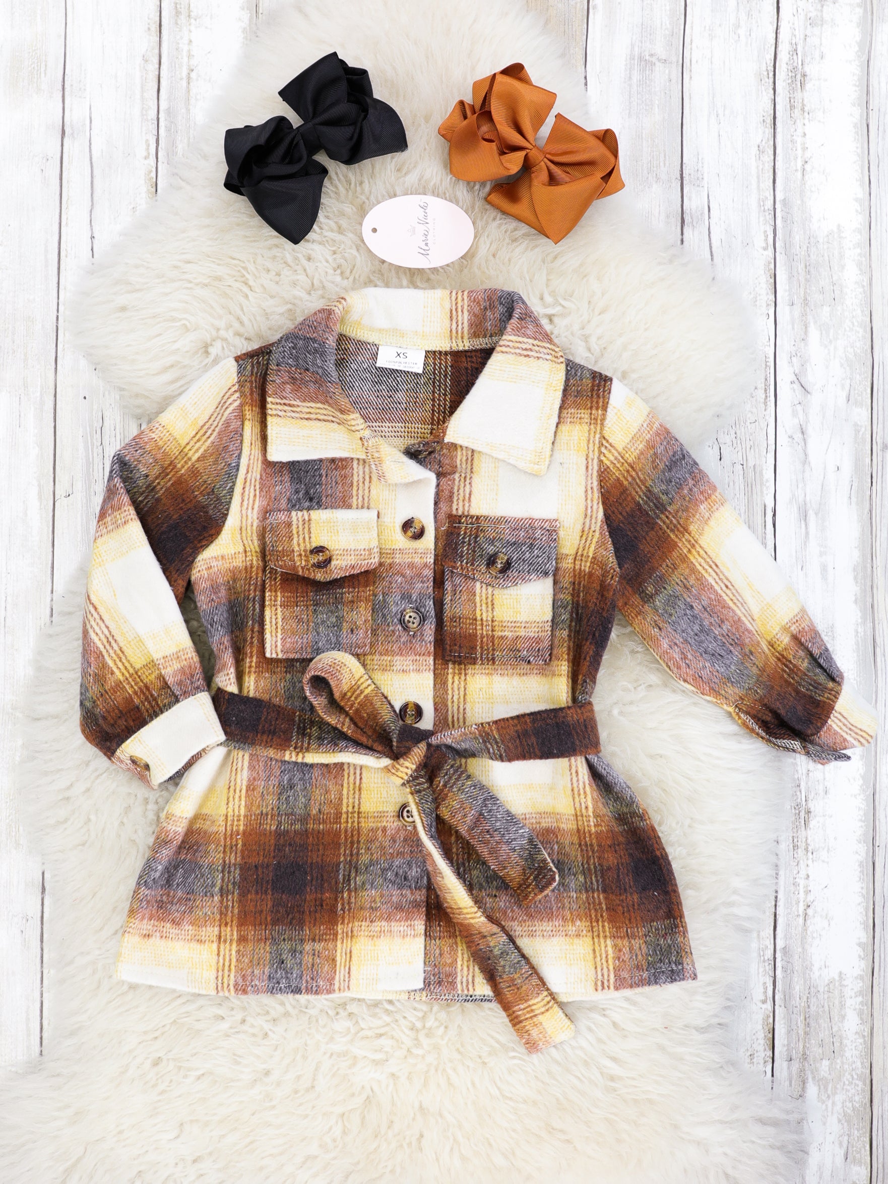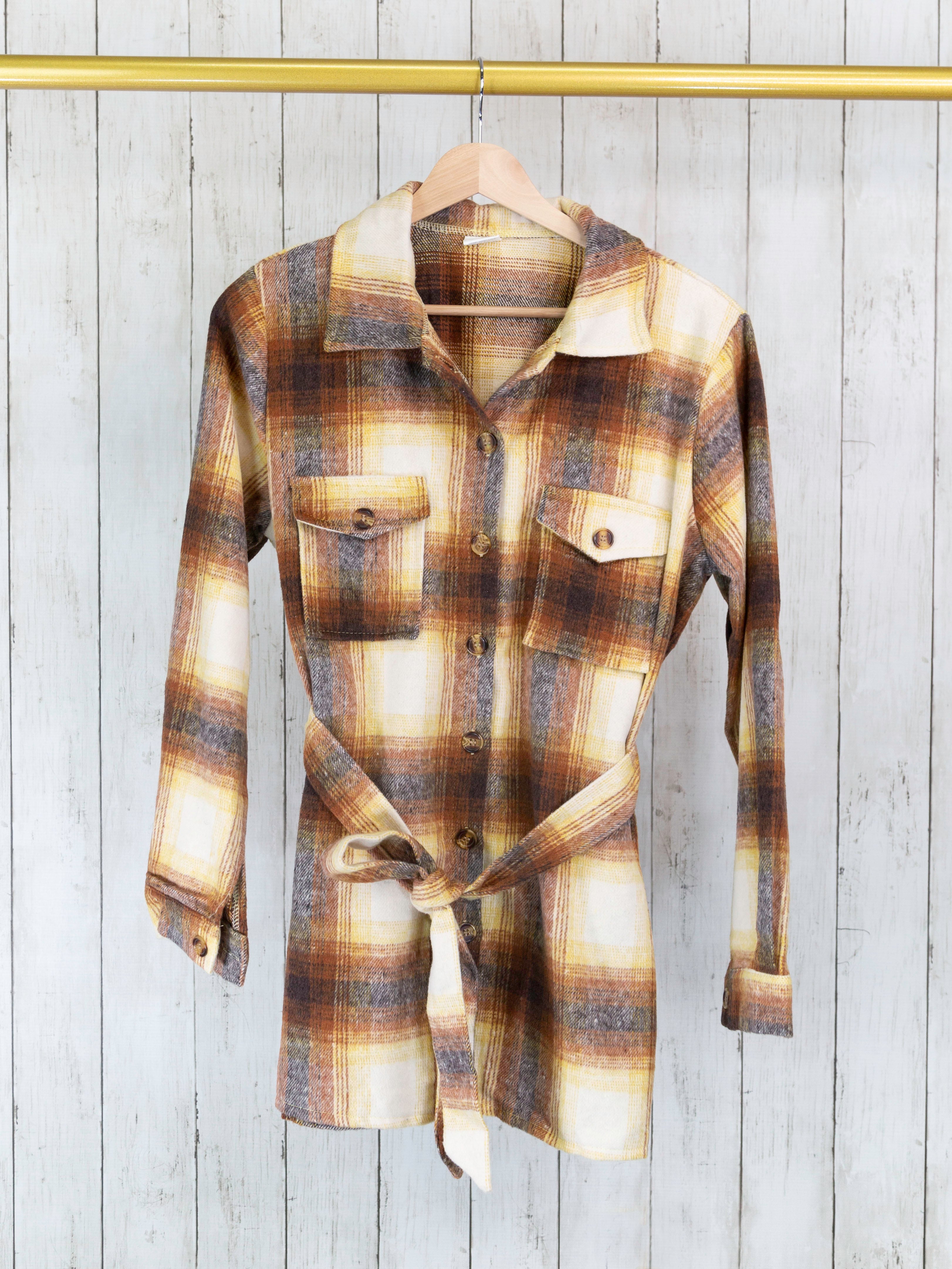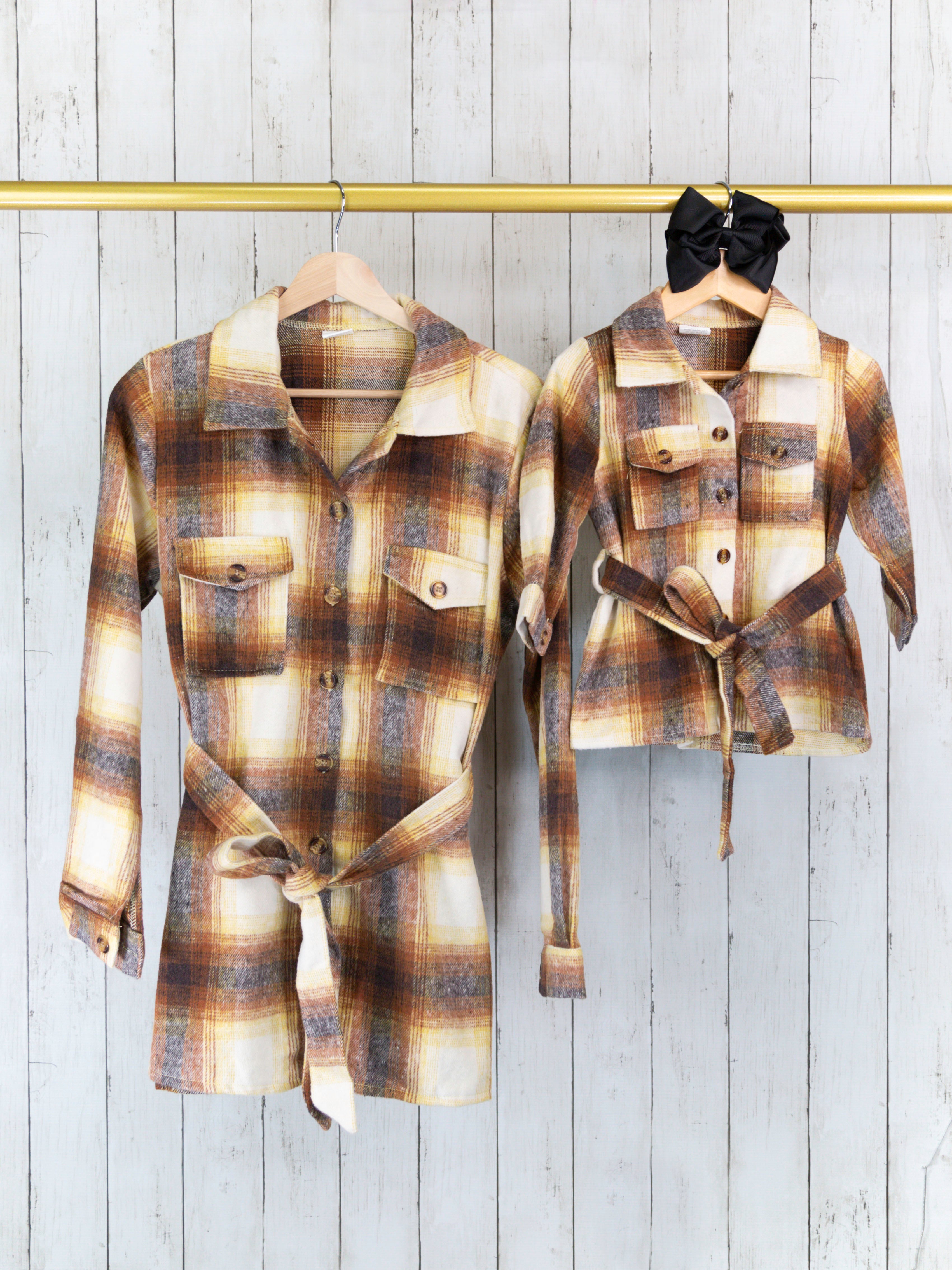 Adorable shackets to match your mini! These cozy flannels feature functional buttons, pockets, & an adjustable tie belt around the waist. The perfect layer to keep you warm all fall & winter!