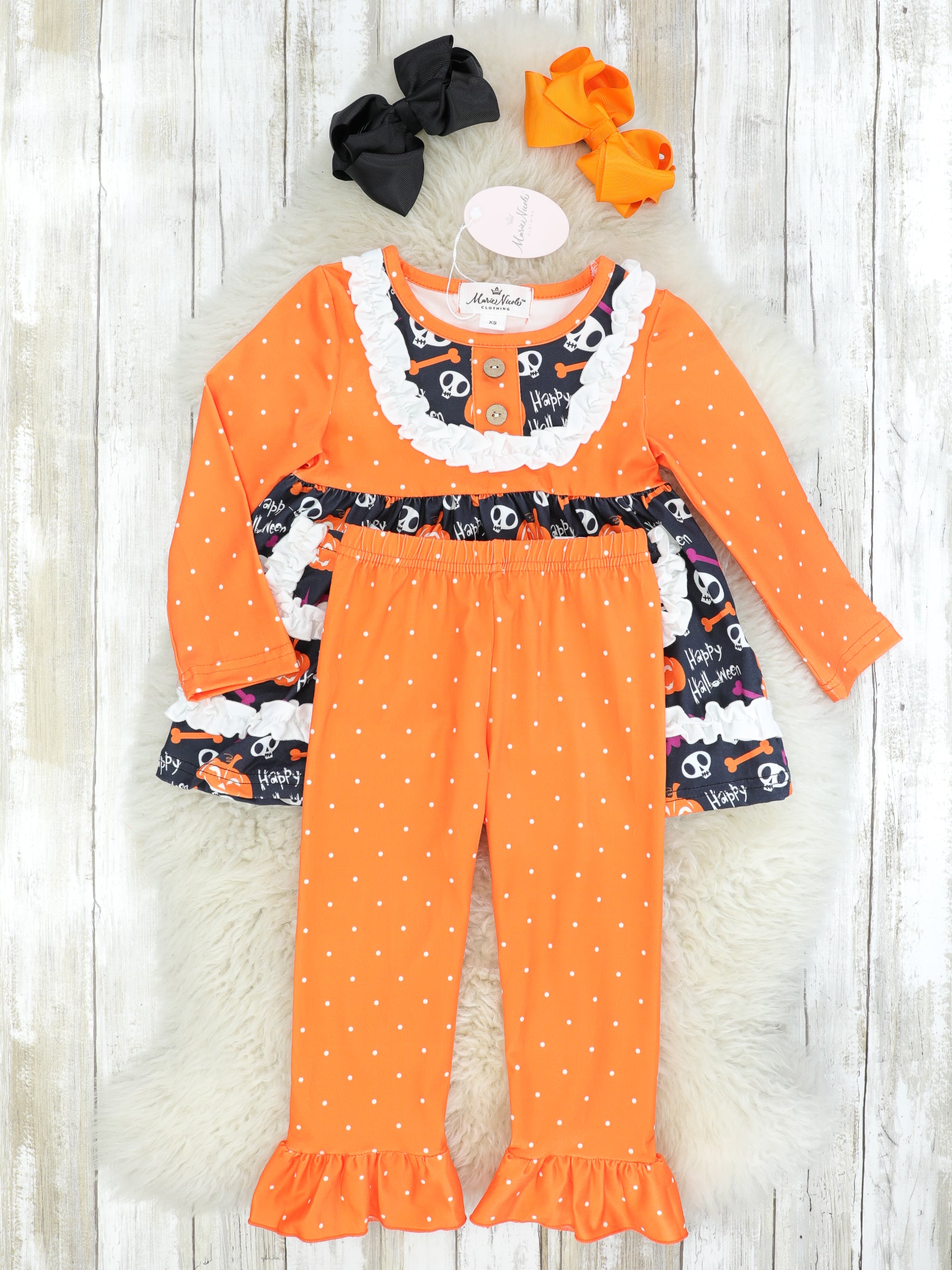 Orange you excited for Halloween? Your sweet girls will be too with this outfit featuring an orange polka dot top with ruffles, pockets, nonfunctional buttons, & Halloween details with matching polka dot pants.