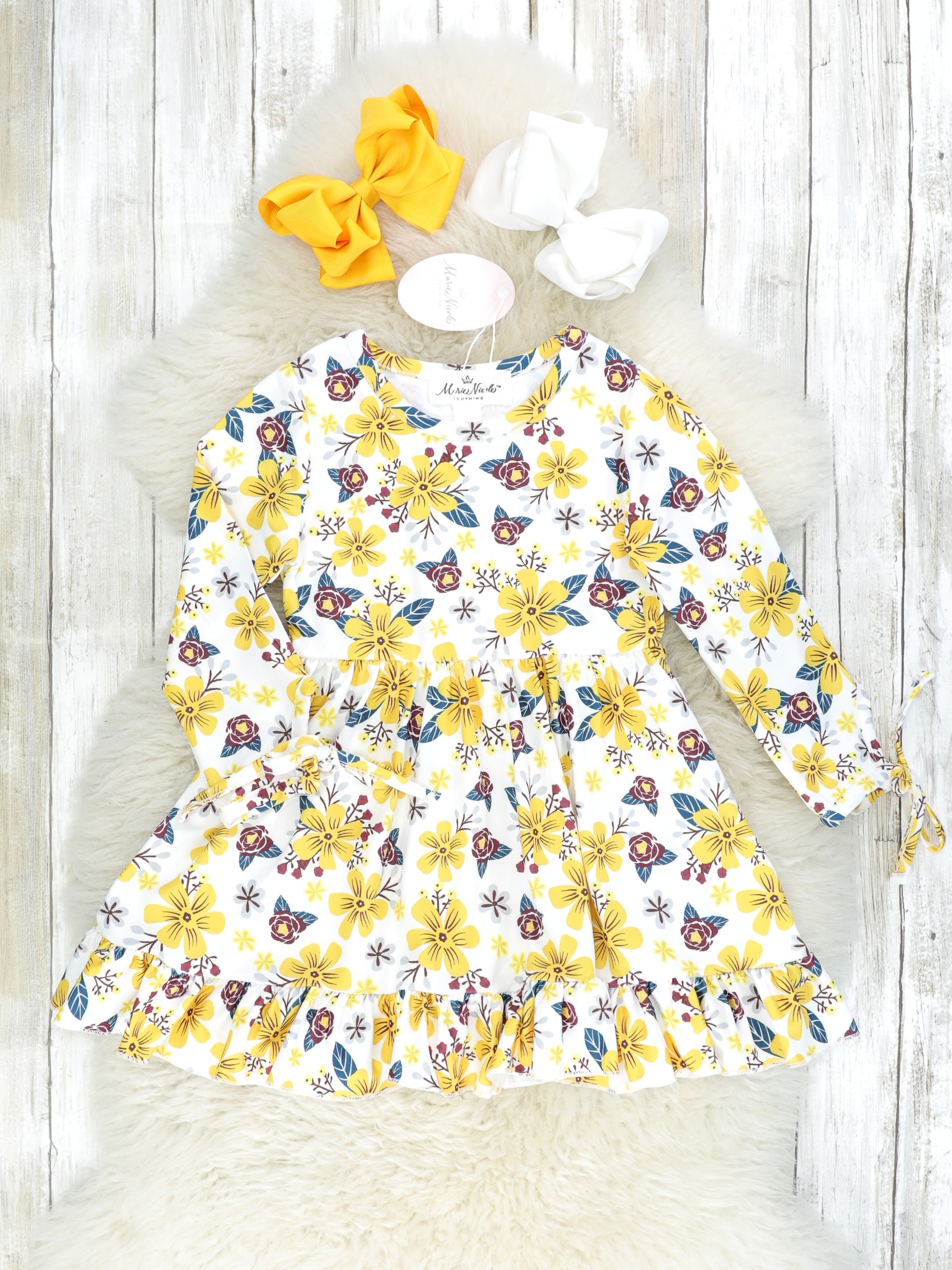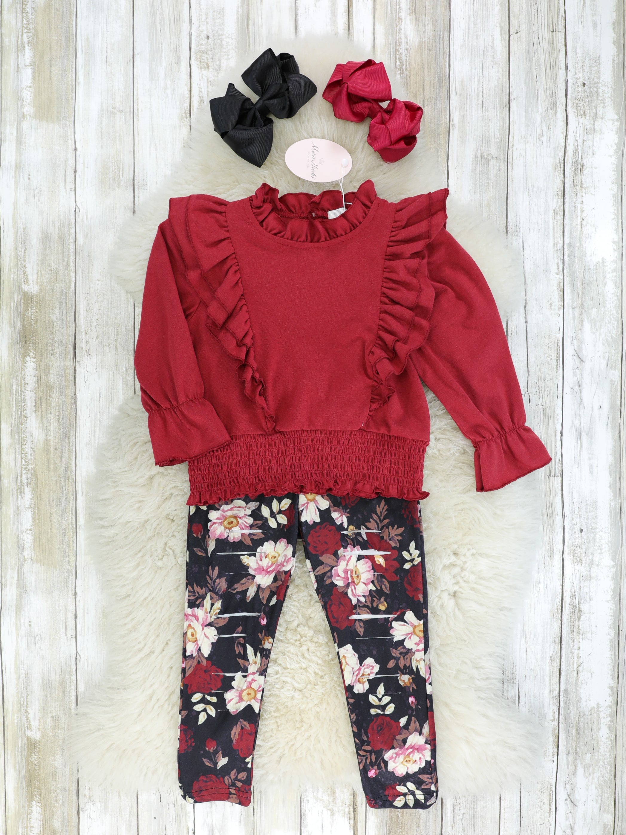 Maroon Smocked Ruffle Long Sleeve & Floral Bottoms Outfit