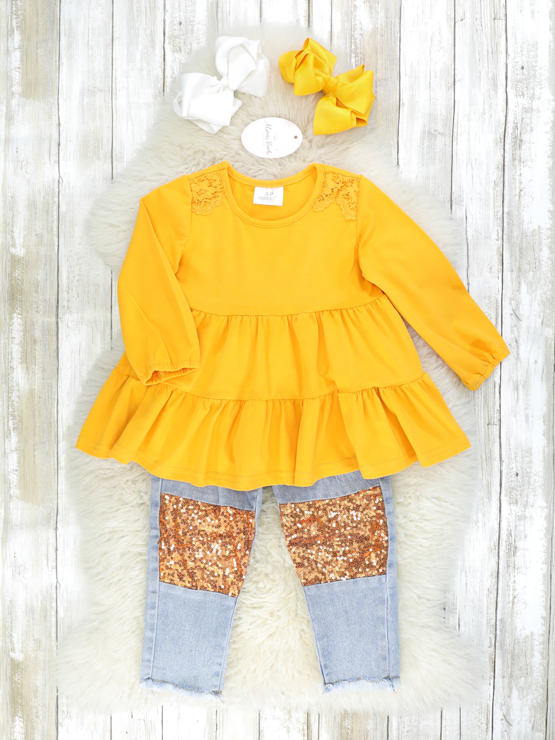 Mustard Lace Tier Top & Distressed Denim Sequin Outfit