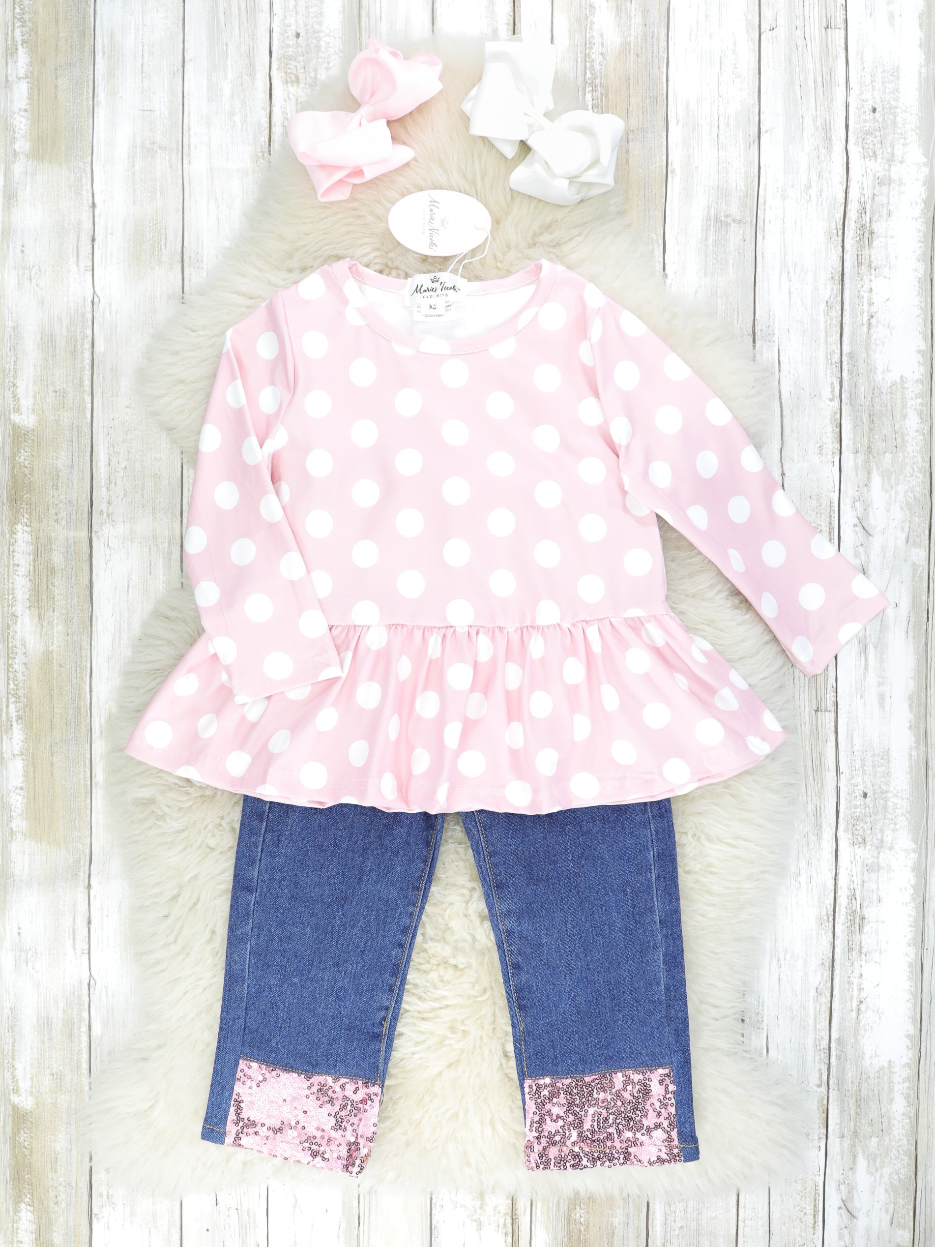 Pink Polka Dot Ruffle Top & Denim Sequin Outfit