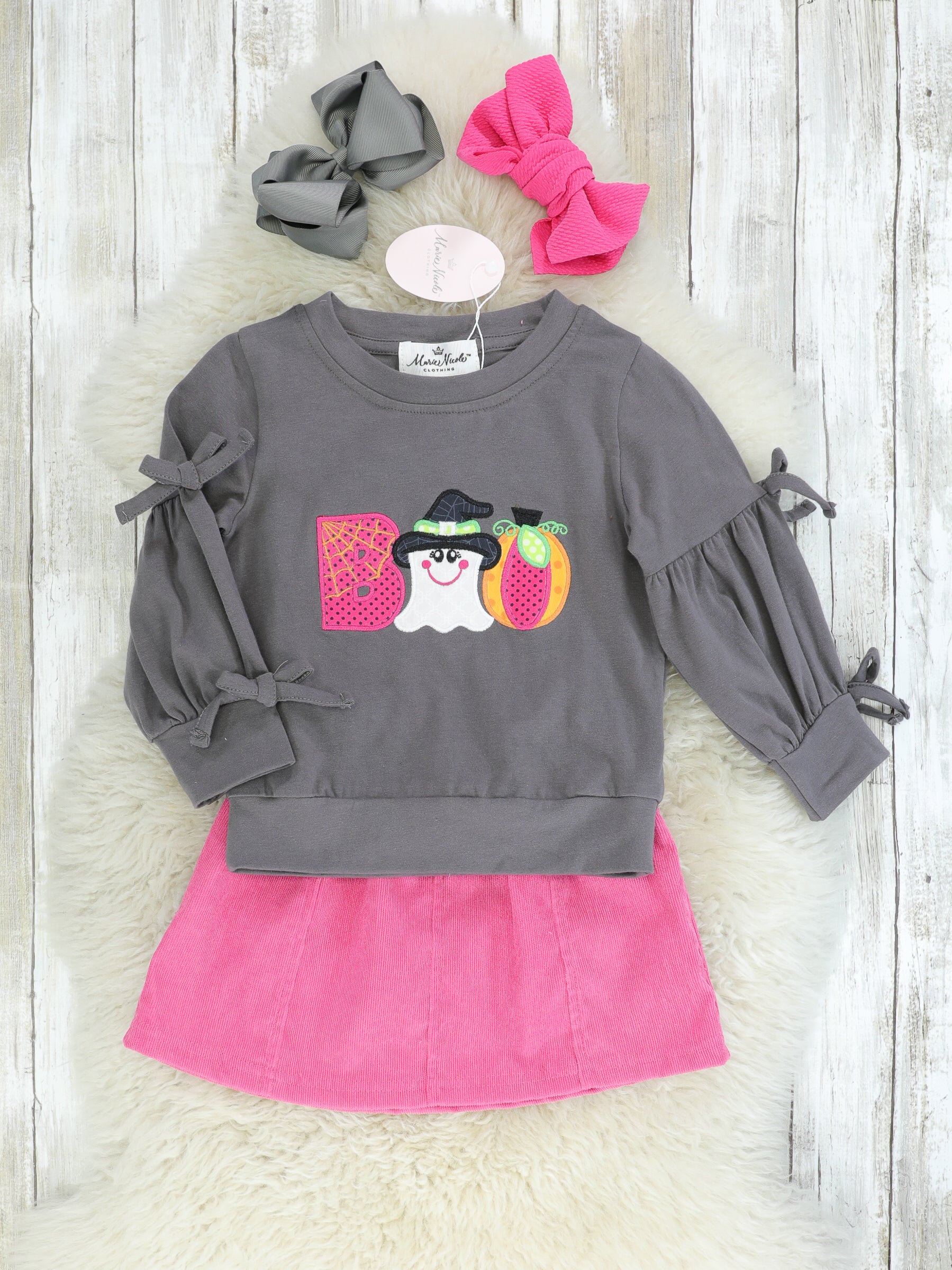 Grey "BOO" Long Sleeve & Fuchsia Skirt Outfit