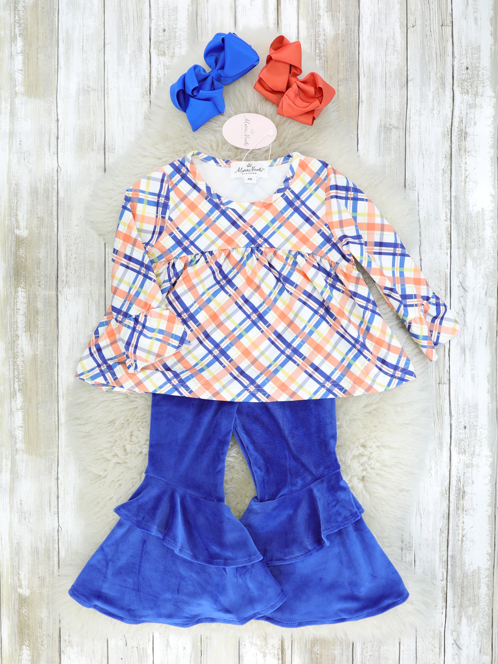 Blue & Orange Plaid Top & Velvet Ruffle Bell Bottoms Outfit