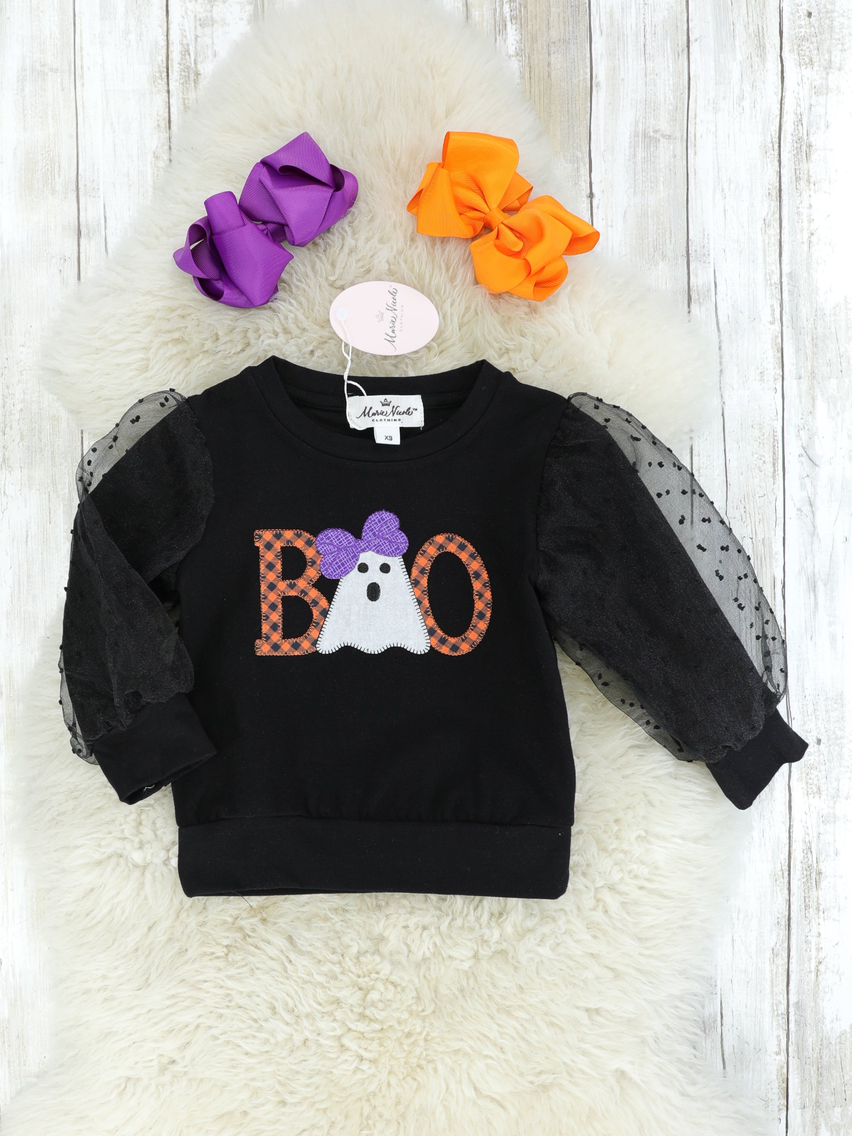 Black Sequin "BOO" Banner Ghost Ruffle Top