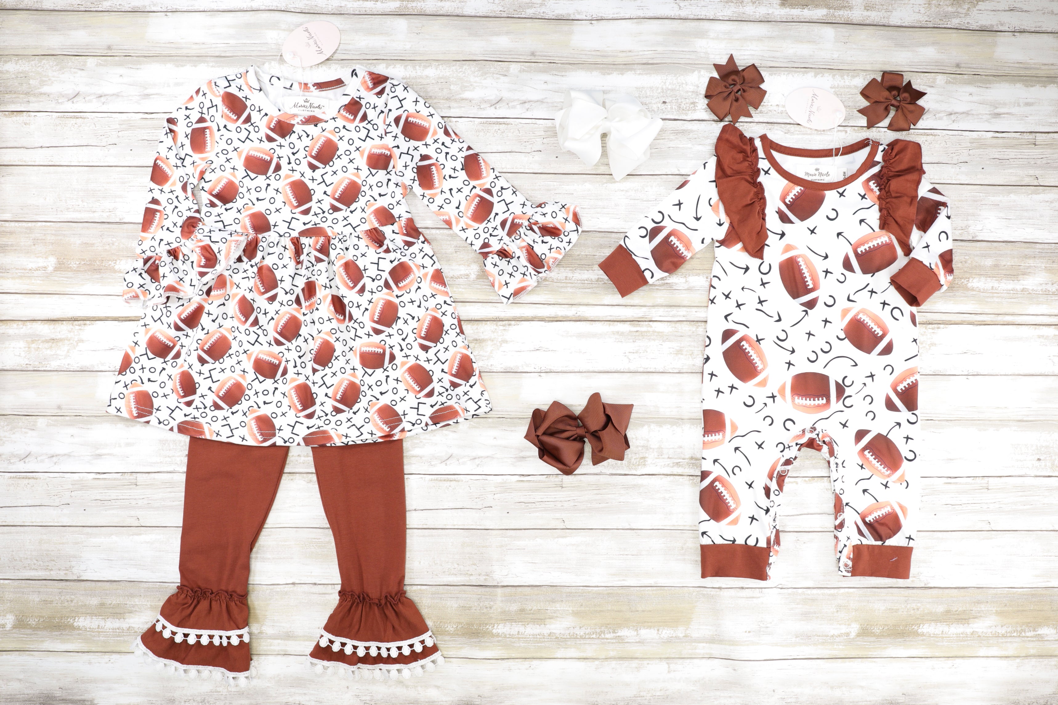 Ready? Set. Hike! This sporty set is perfect for your football gals! This romper features a football design with flutter trim & brown trim.