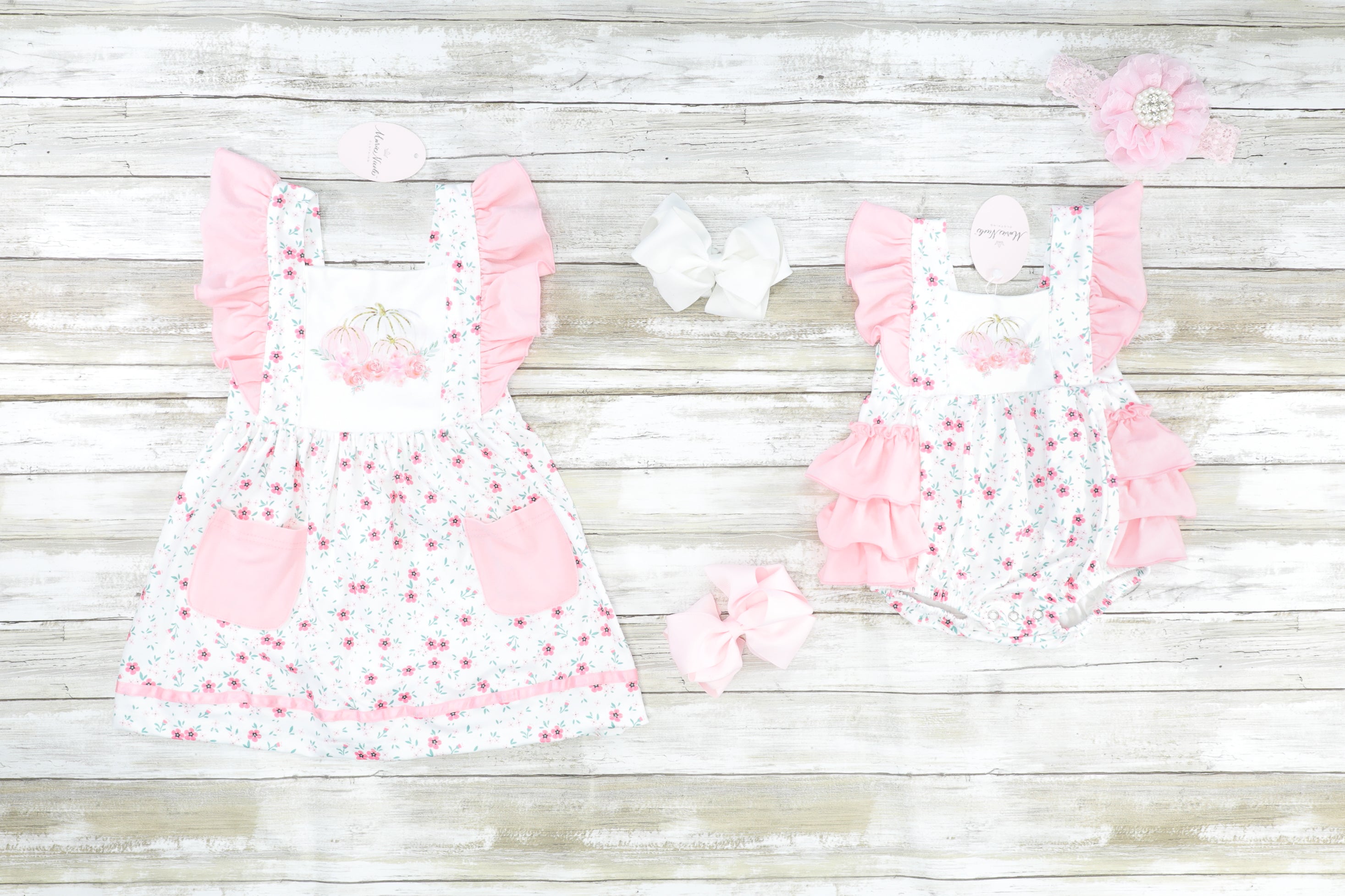 Pretty? Check! Pink? Check! Pumpkins? Check- this sister set has everything your girl needs! This dress features a darling floral design, functioning pockets, pink trim, flutter trim, & pink pumpkin details.