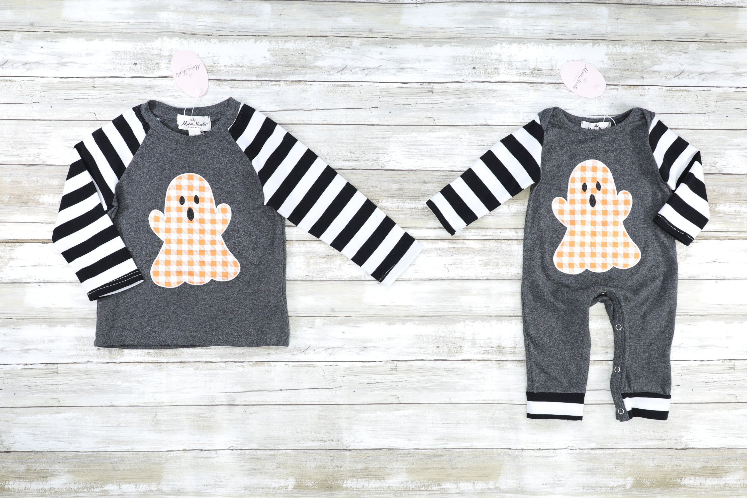 This charming sibling set is un-BOO-leviable! This charcoal shirt features a gingham ghost appliqué & striped raglan sleeves.