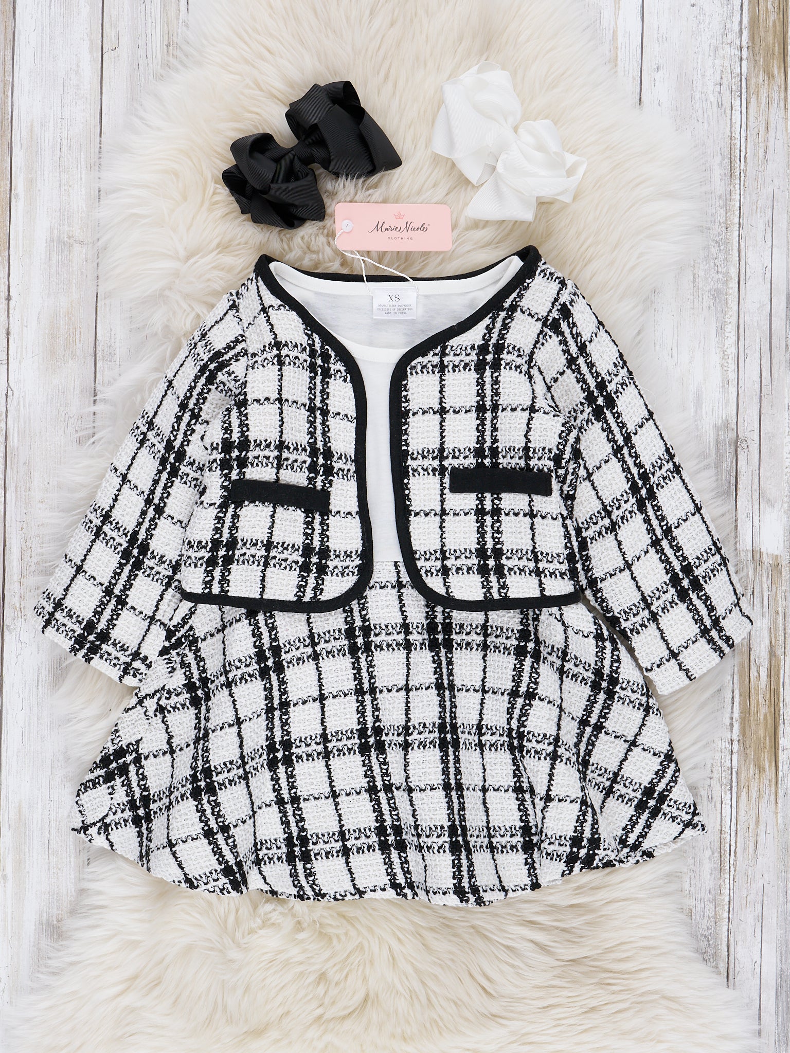 White & Black Plaid Dress W/ Cardigan Set