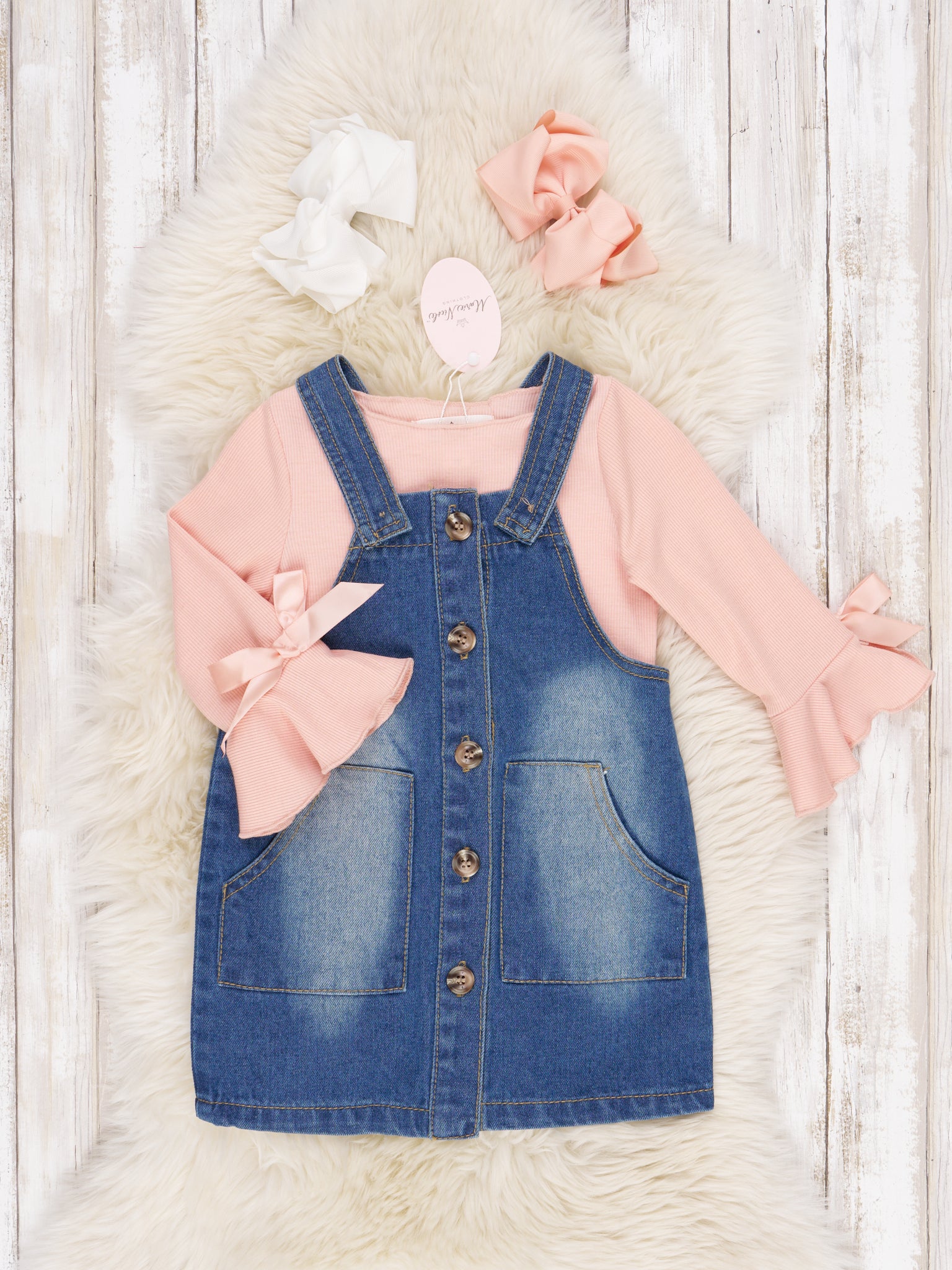 Light Peach Bell Sleeve Top & Denim Overall Dress Set