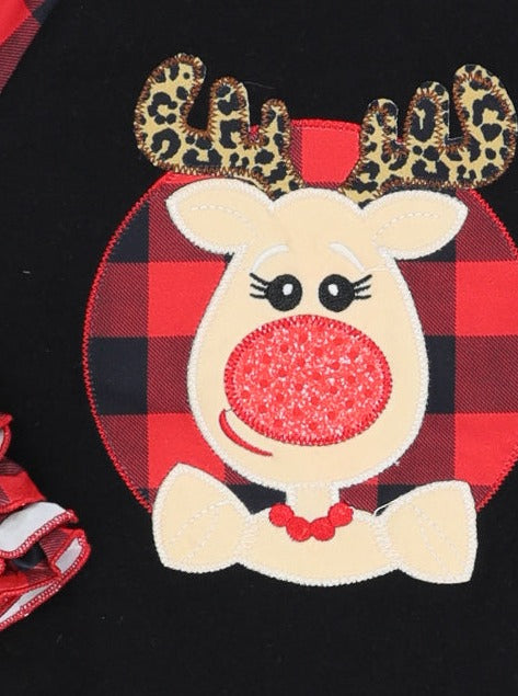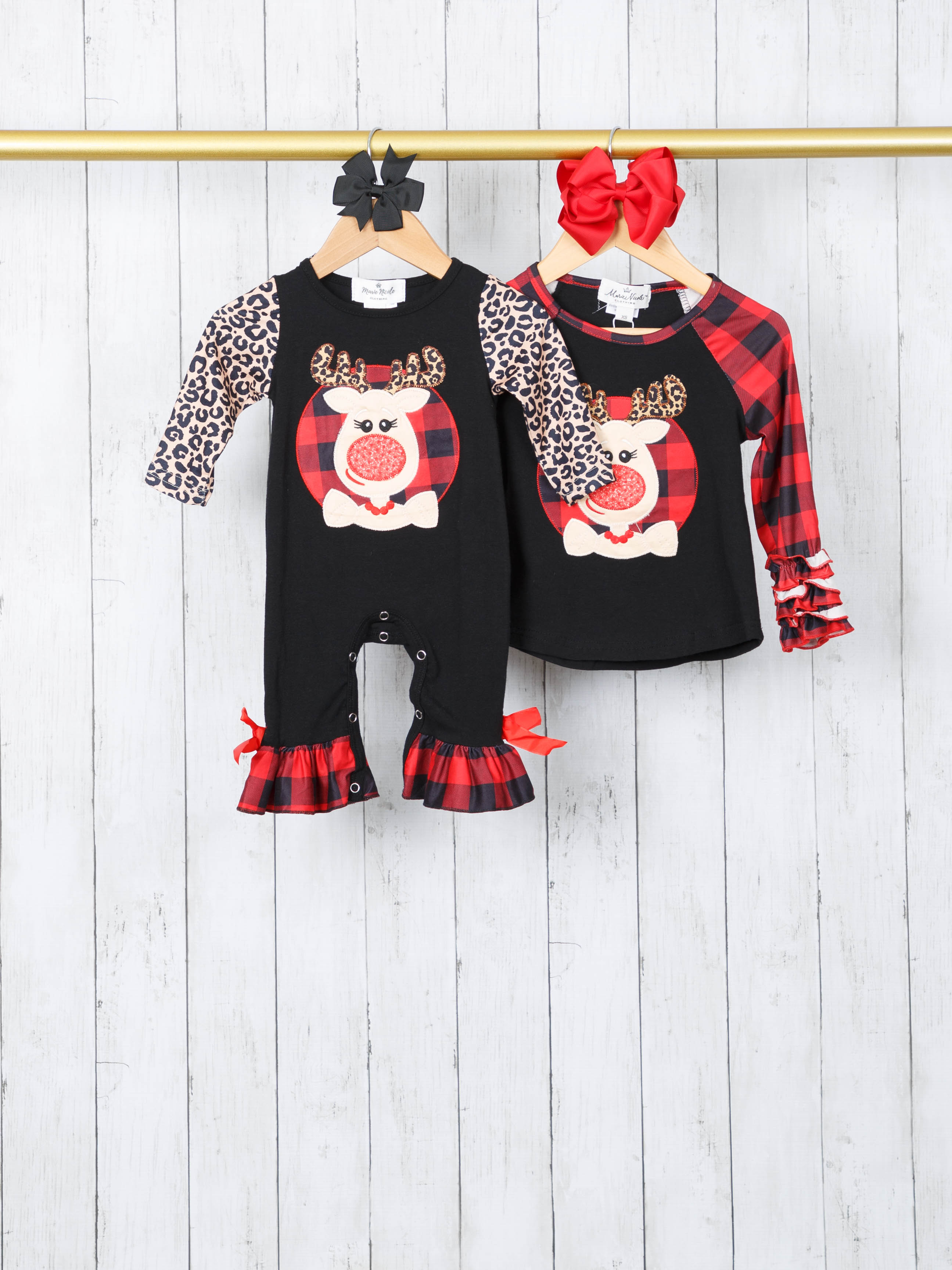 This cozy sister set is a gorgeous Christmas favorite! This black shirt features the sweetest red nose reindeer appliqué with leopard print antlers, buffalo plaid raglan sleeves, & icing ruffles.