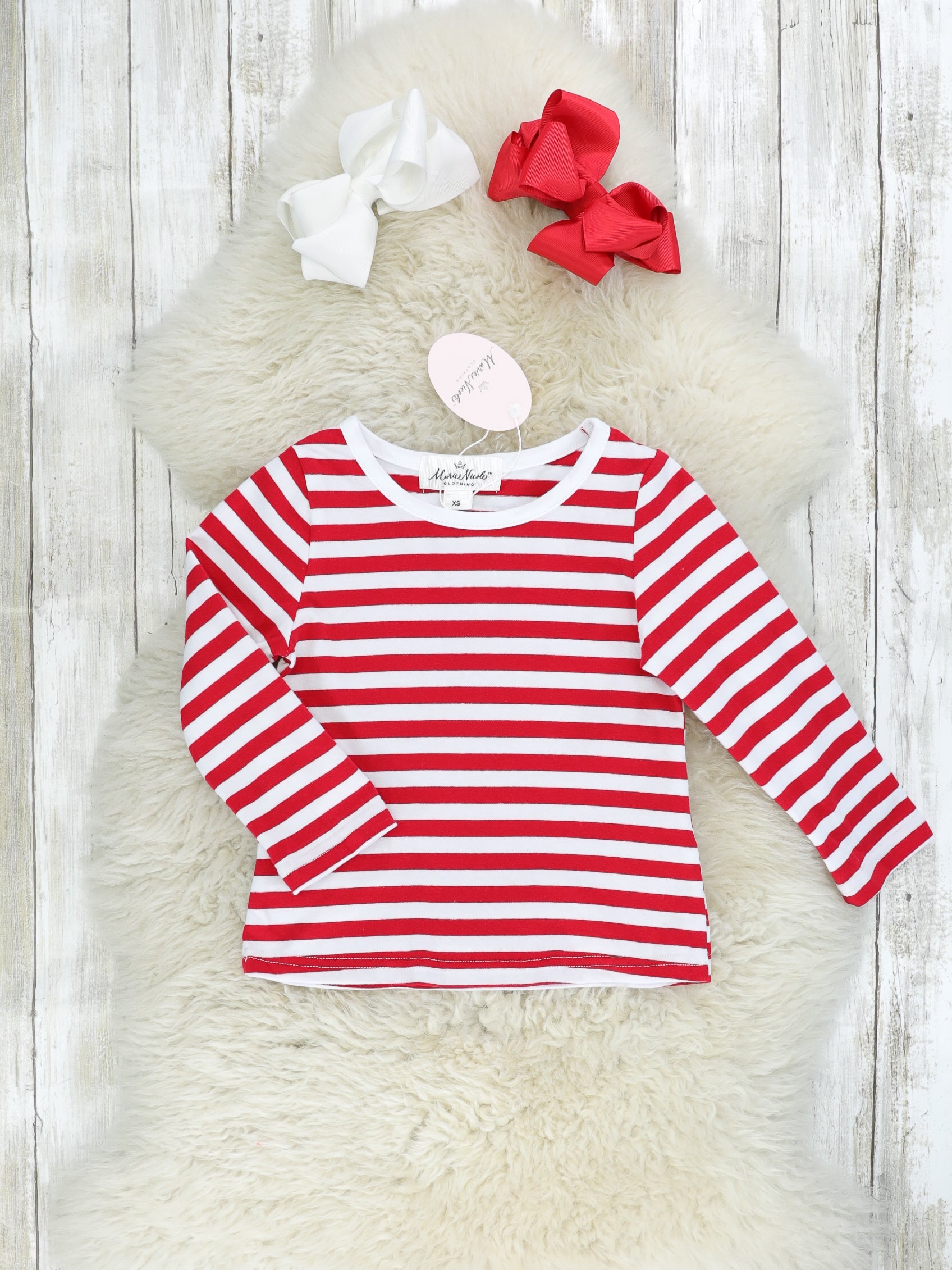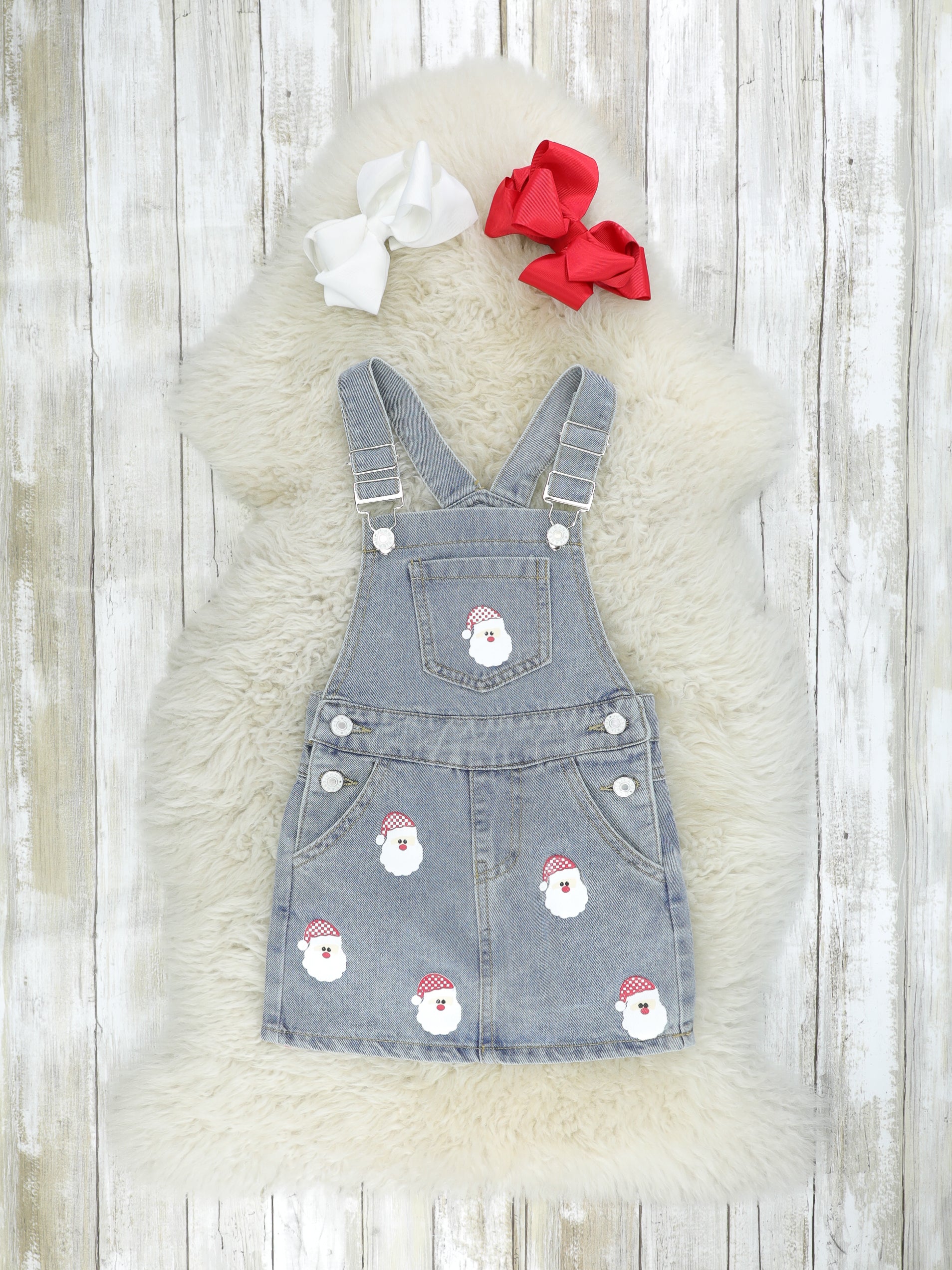 We cannot get OVER this outfit at ALL! This set features a red striped shirt & a denim overall dress with the sweetest Santa details, pockets, and adjustable straps.