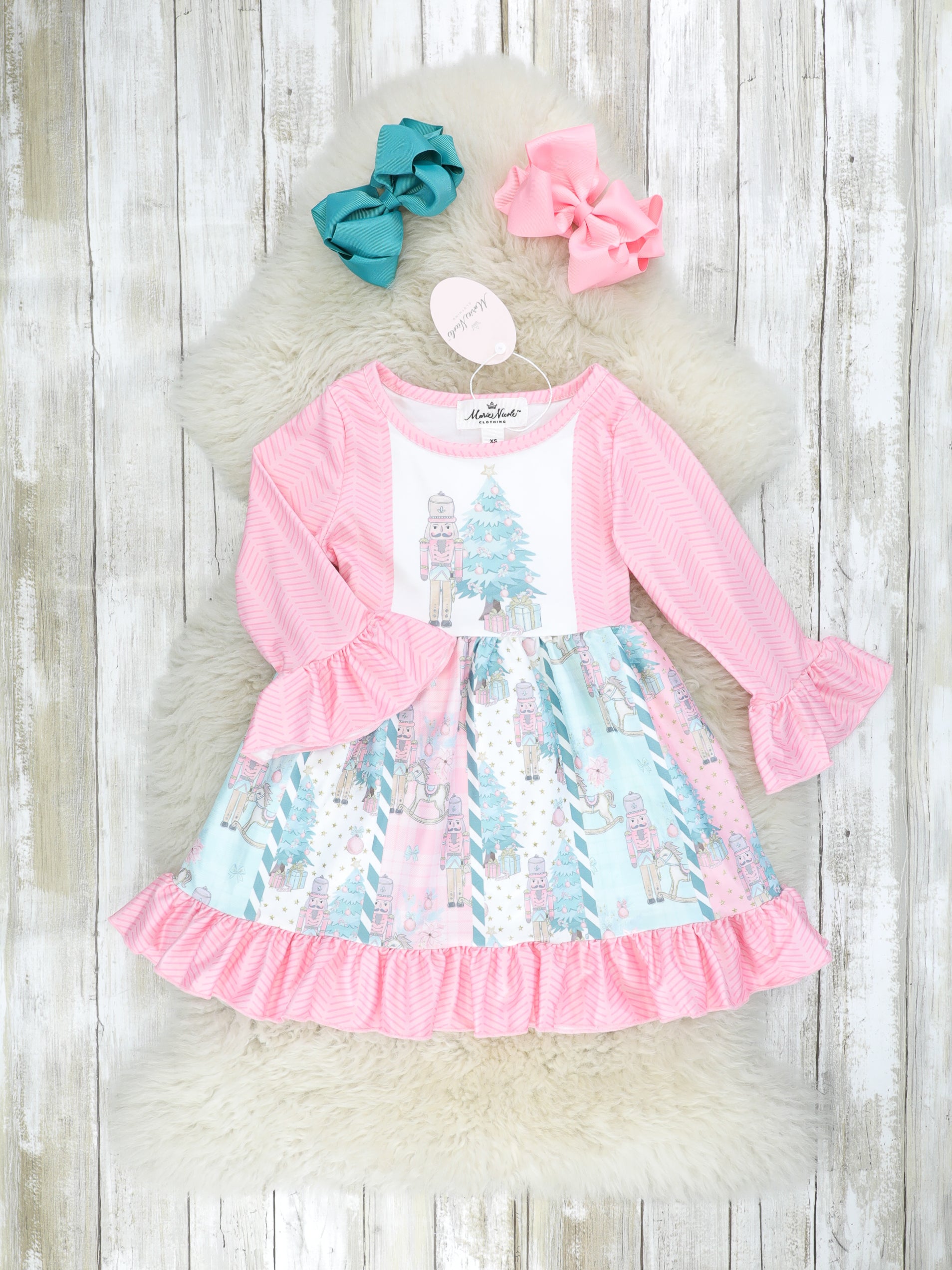 Pink Christmas Tree Ruffle Top & Blue Suspender Skirt Set