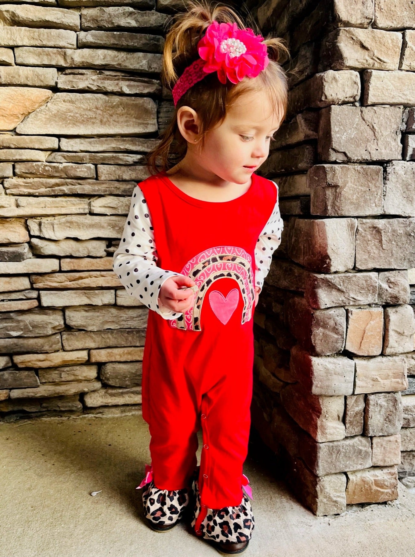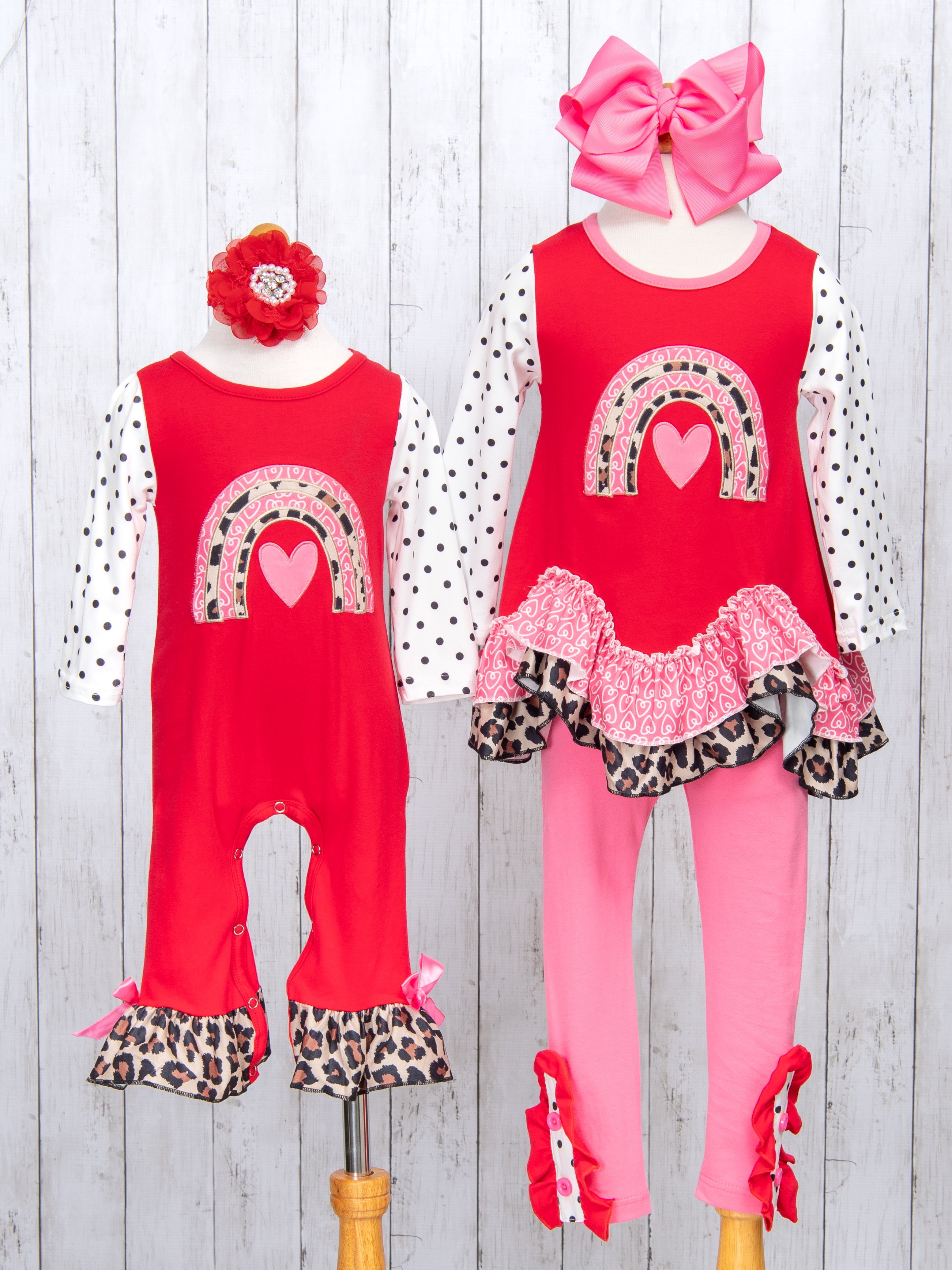 A sassy sister set for your leopard-loving girls! This red romper features polka dot raglan sleeves, a darling rainbow appliqué, leopard ruffles, & pink bow details at the ankles.