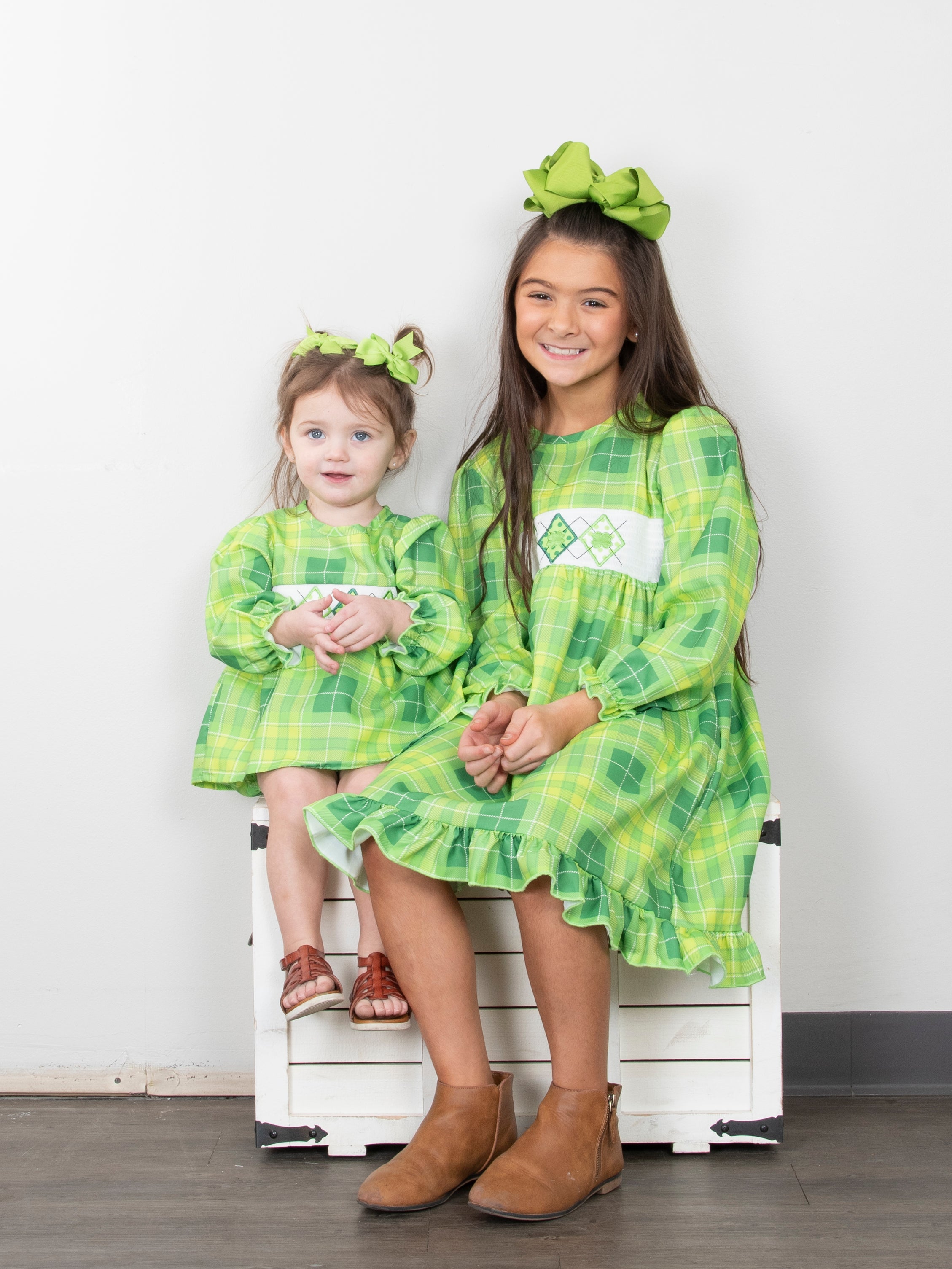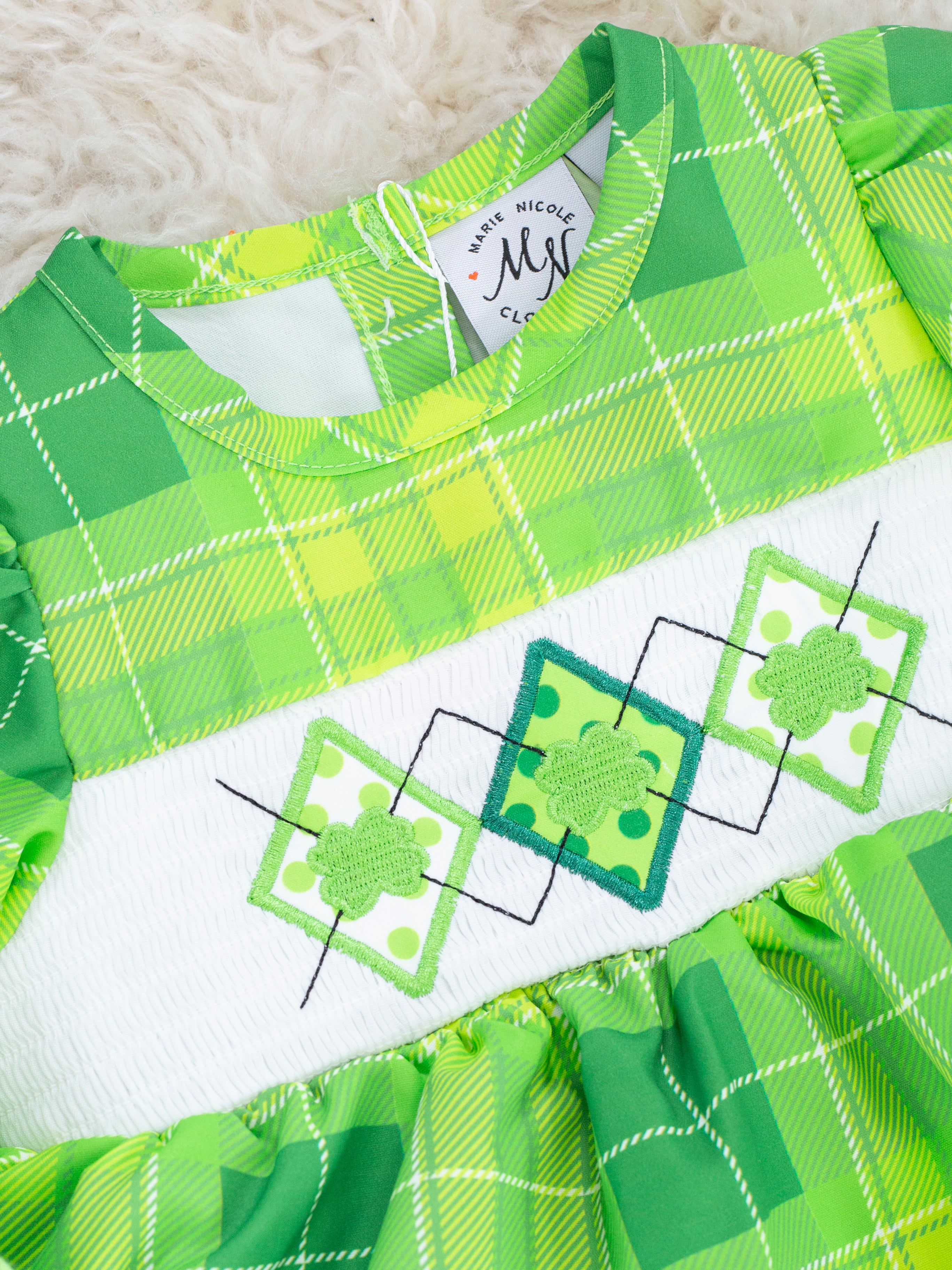 A special sibling set to dress up all the kiddos this St.Patricks day! This dressy romper features green plaid, smocking across the chest, & embroidered diamond clovers.