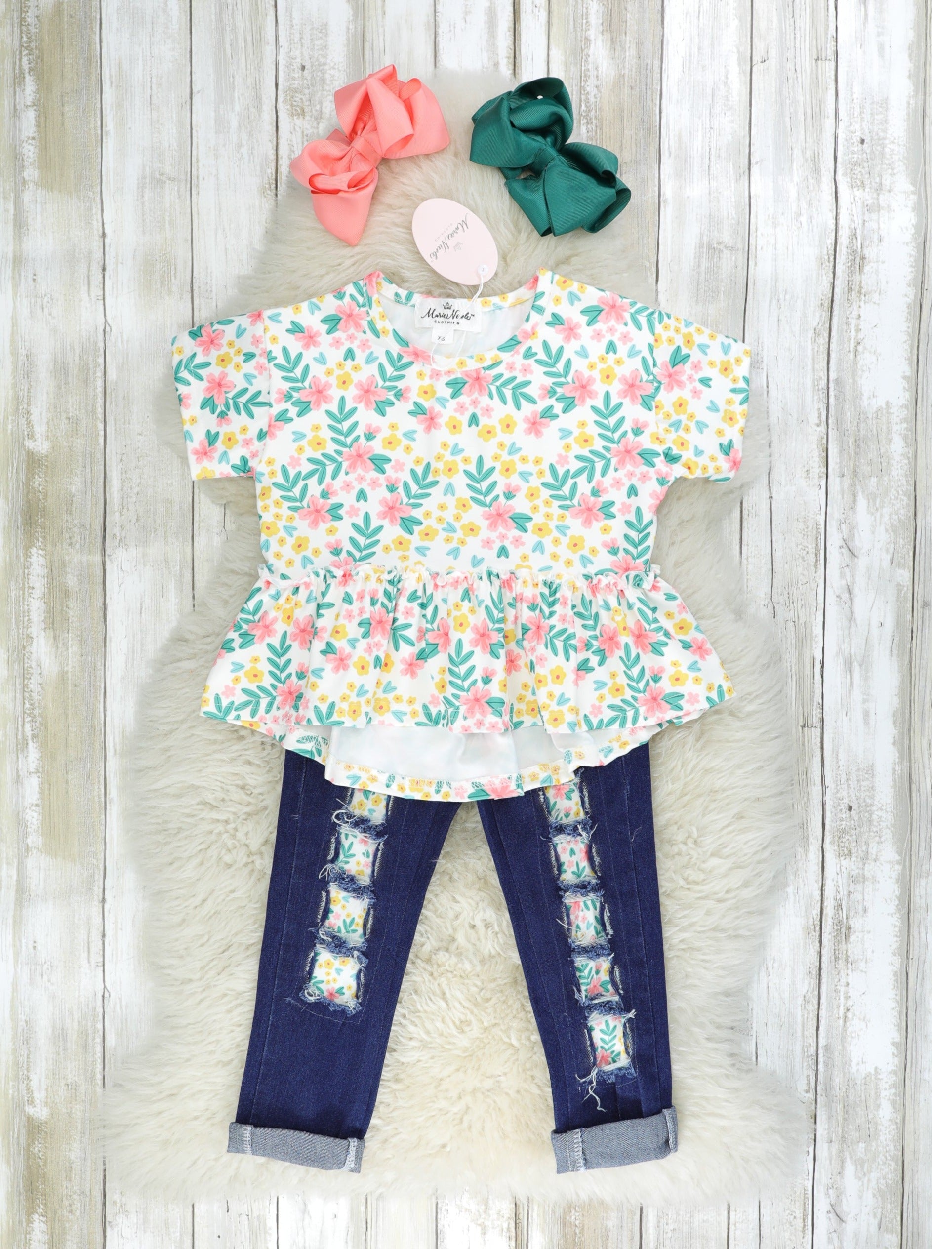 Yellow Floral Peplum Top & Distressed Denim Outfit