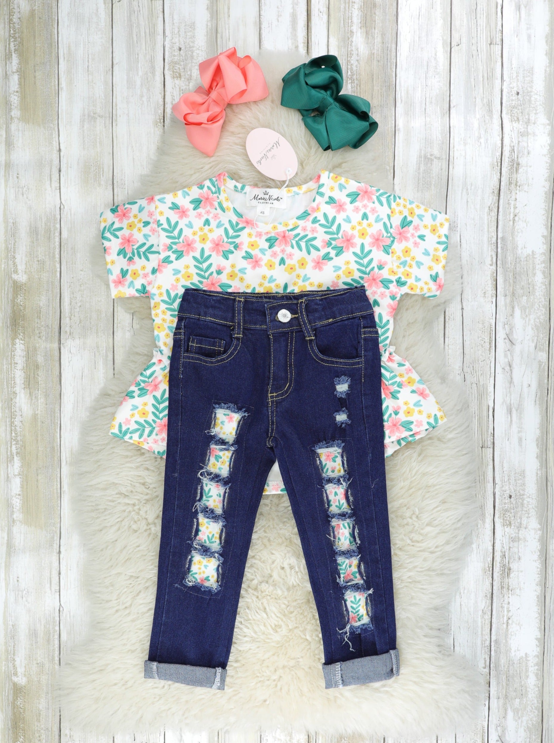 This spring outfit is perfect for your dainty girls! This outfit features a gorgeous floral peplum top & distressed denim jeans with matching floral patches.