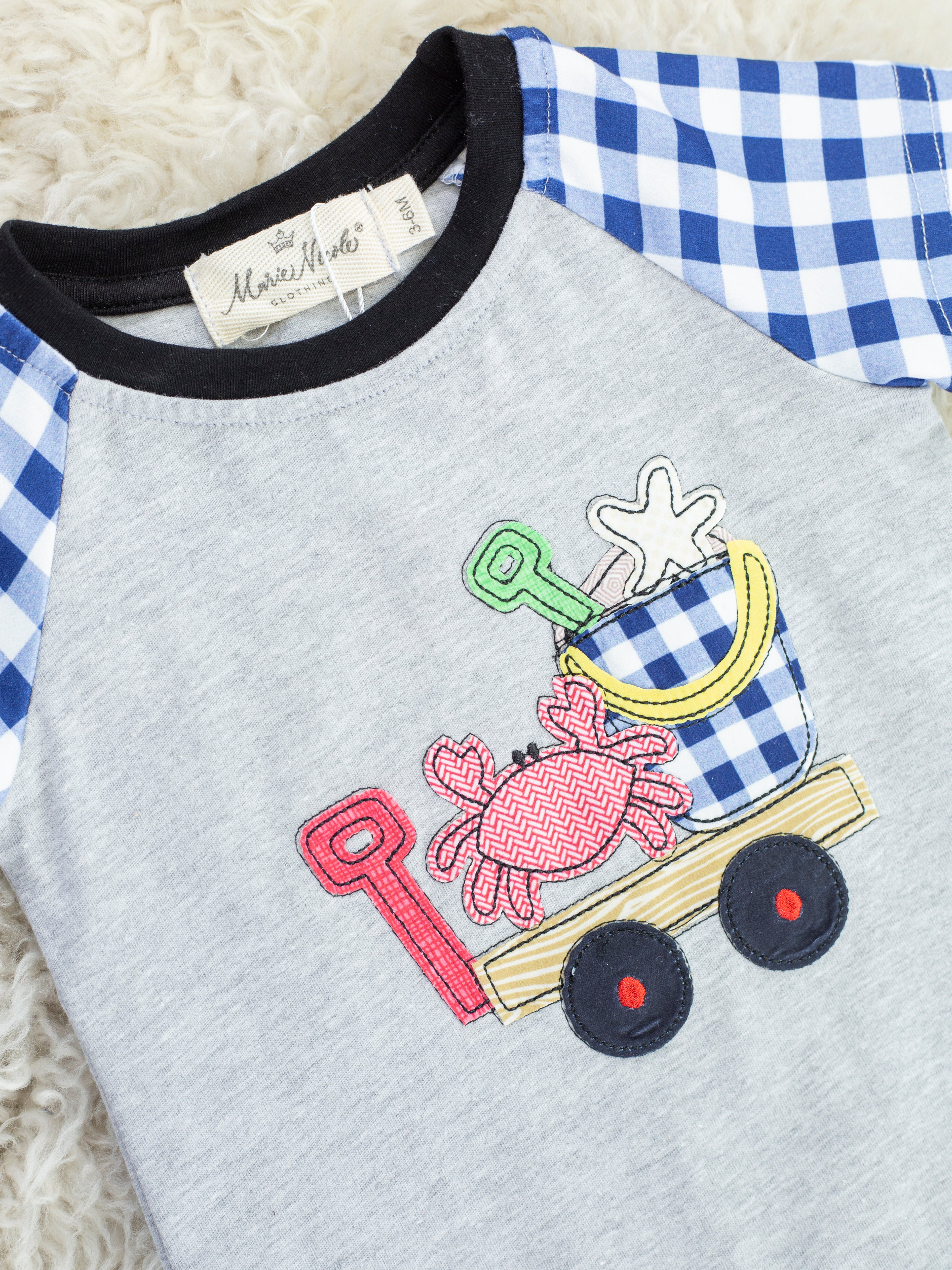 The best brother set for WATERever beach trip you have planned! This grey romper features a beach wagon appliqué & blue gingham raglan sleeves.