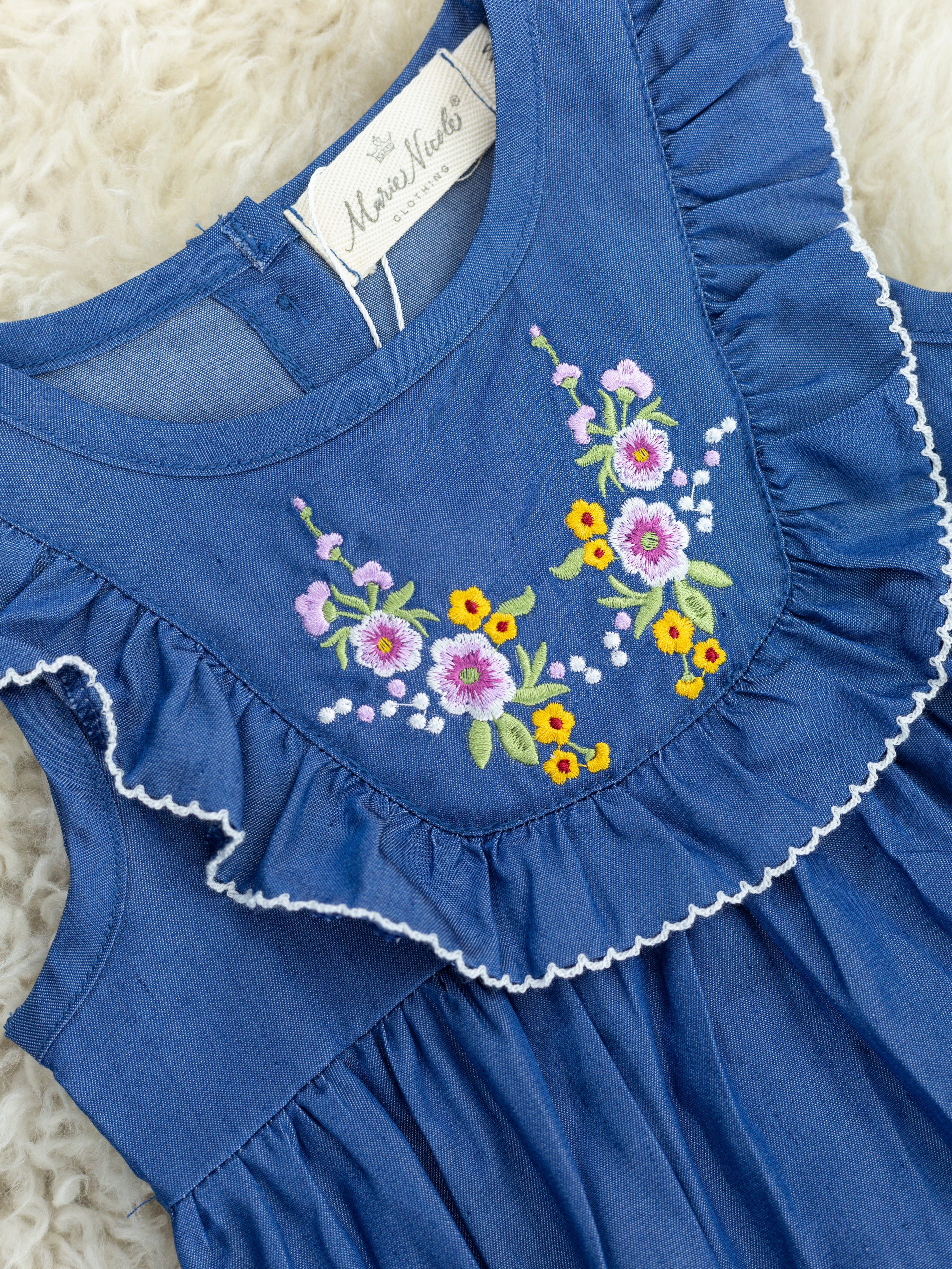 A precious sister set for warm spring days! This chambray romper features embroidered florals, ruffle details, & buttons at the nape of the neck.