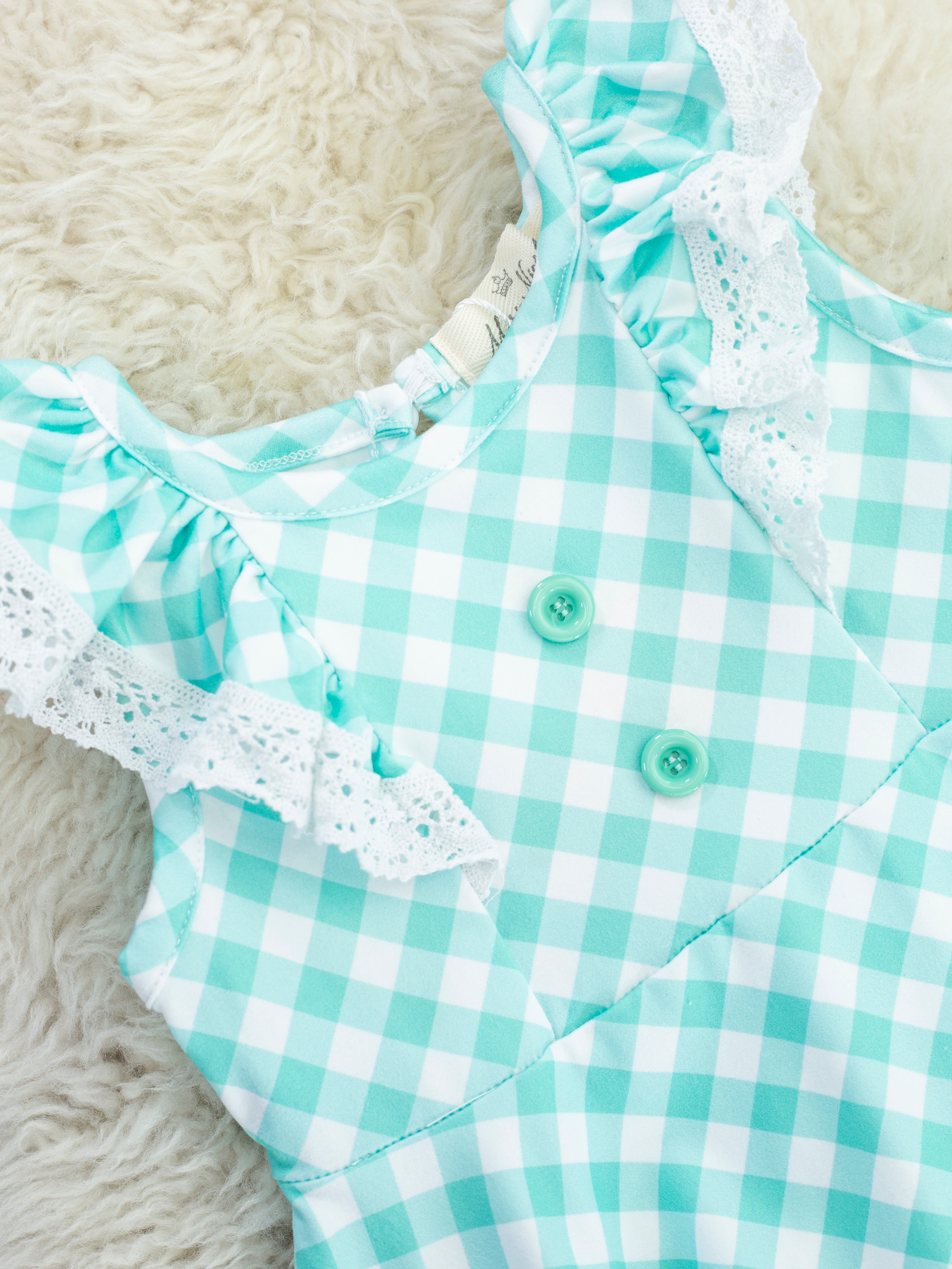 This gorgeous dress is perfect for spring days! This dress features mint gingham, decorative buttons, flutter sleeves, doily lace trim, & ruffle details.